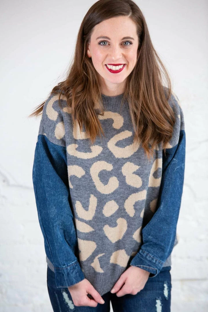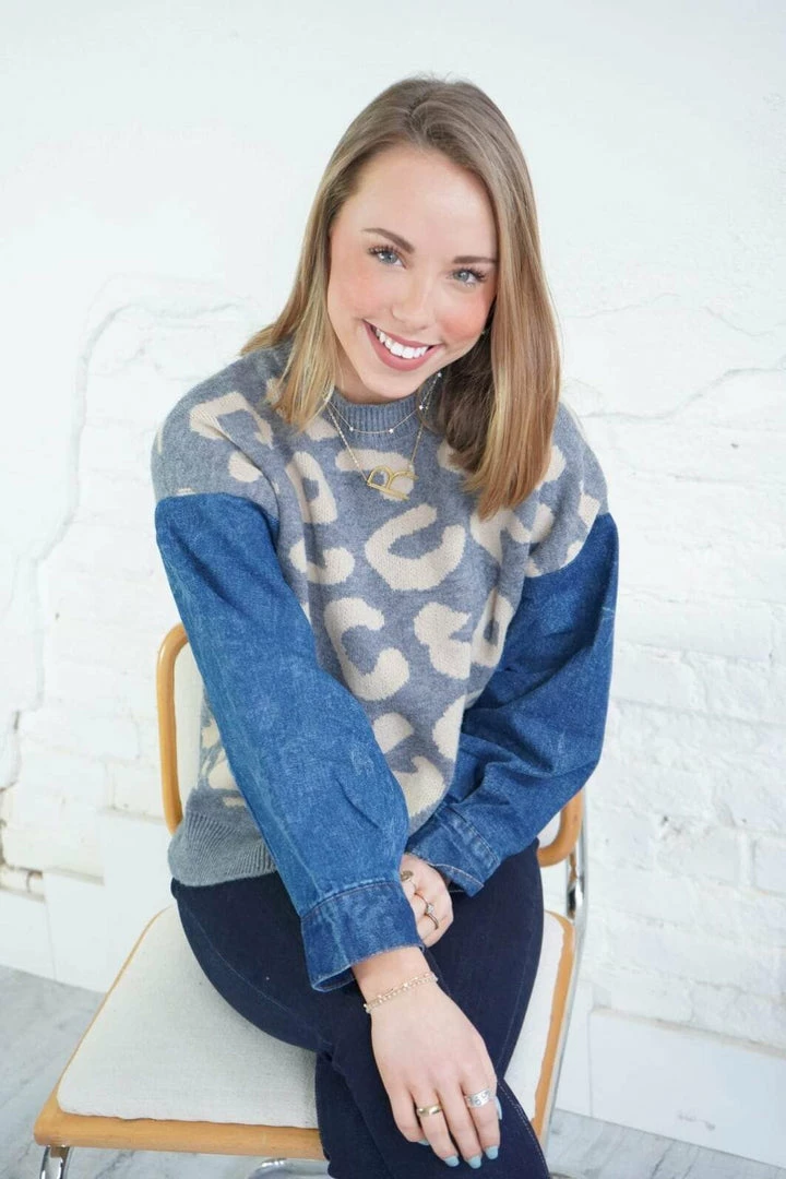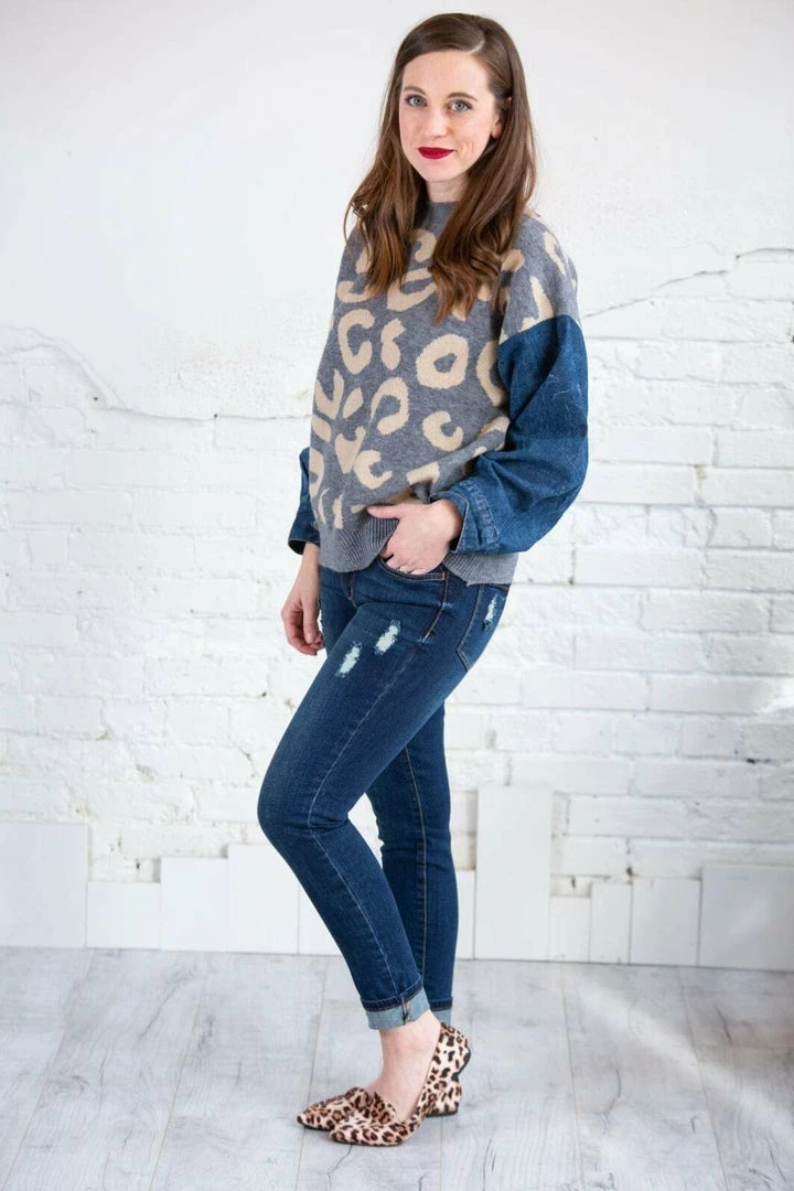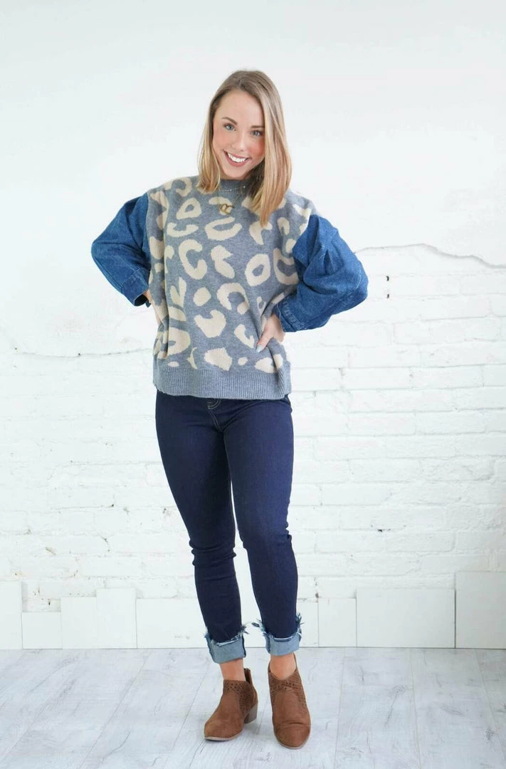 I’m not sure we have ever had such a unique piece! This incredible top features a traditional relaxed fit sweater in a blue leopard print with DENIM sleeves!!! The sleeves are puffed with a button cuff at the wrist. Easy for rolling up or just leave them and do a French tuck for a super fashion forward look!
