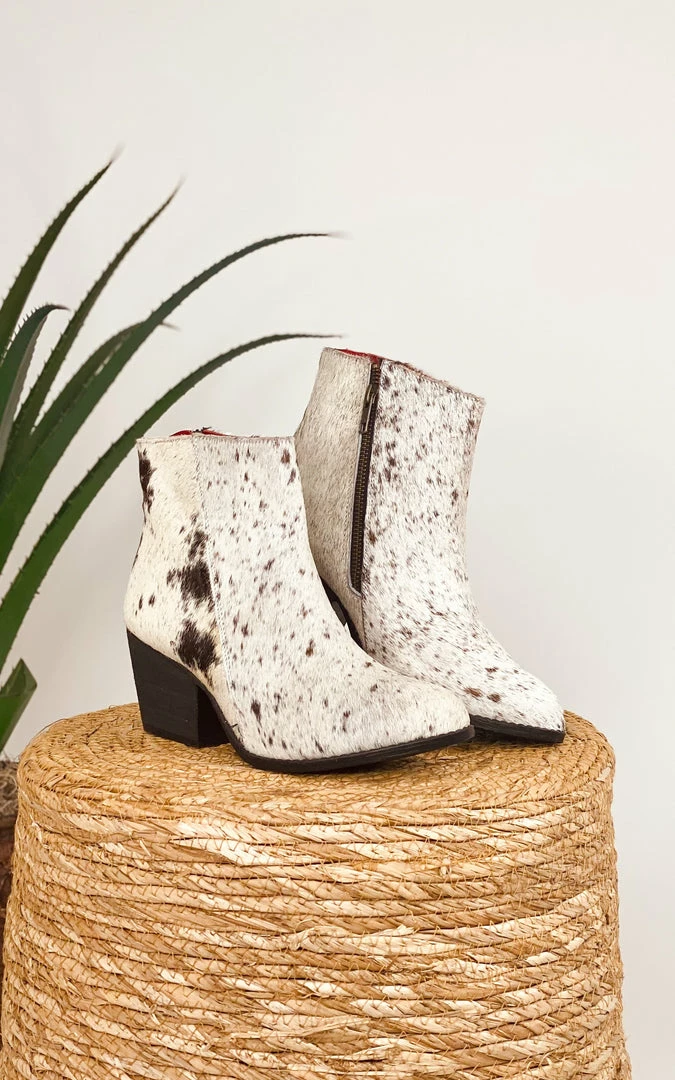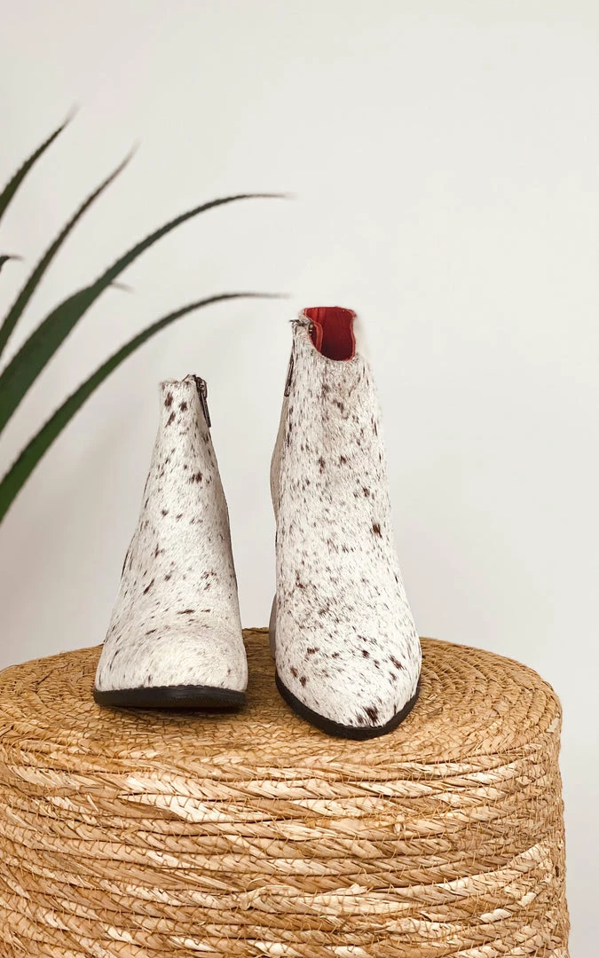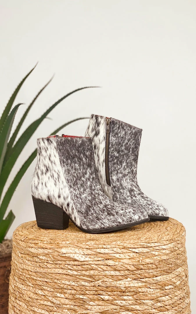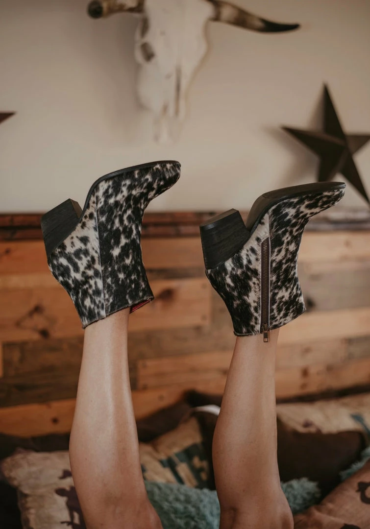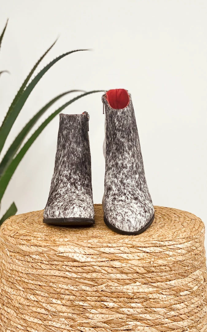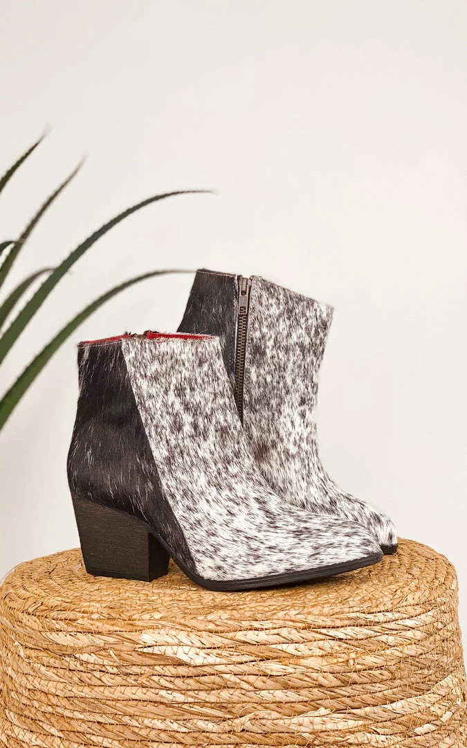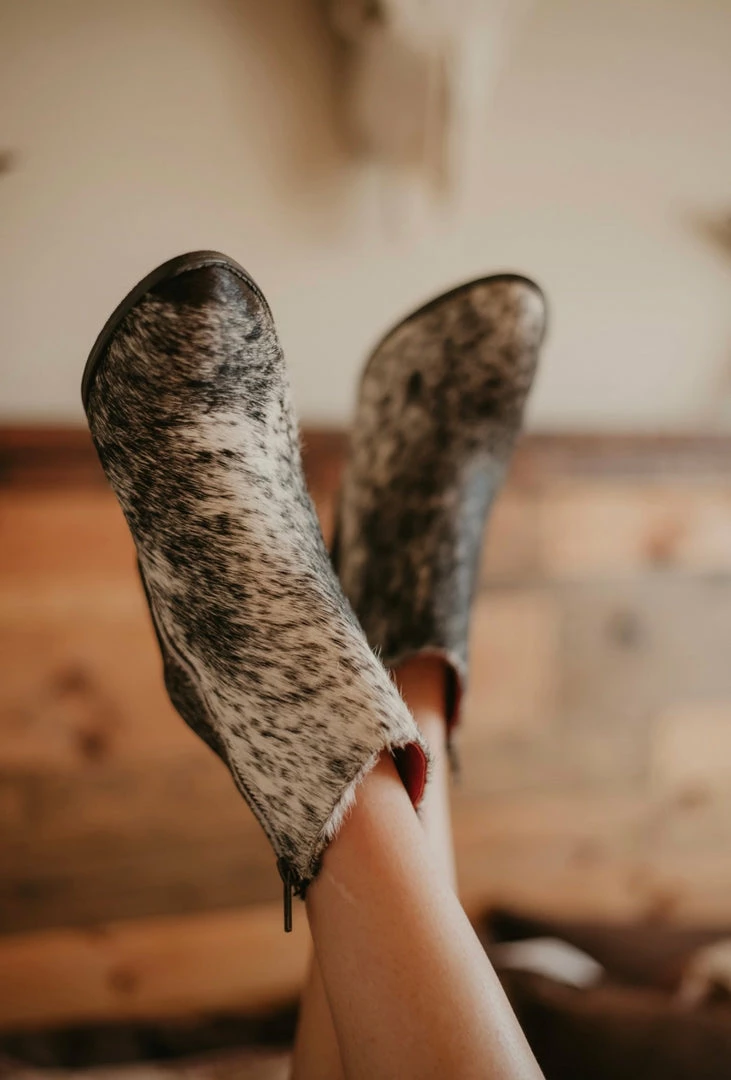 All hides WILL VARY as cowhides are unique products and individual. All booties are black and white hide mixes.