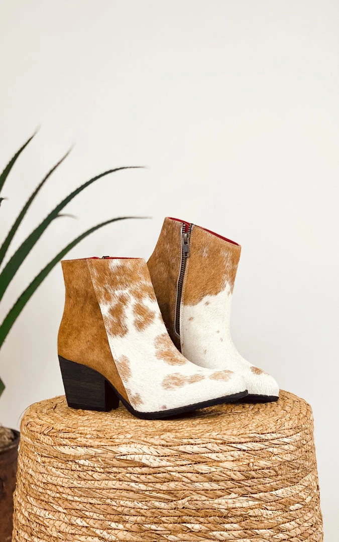 All hides WILL VARY as cowhides are unique products and individual. All booties are brown and white hide mixes.