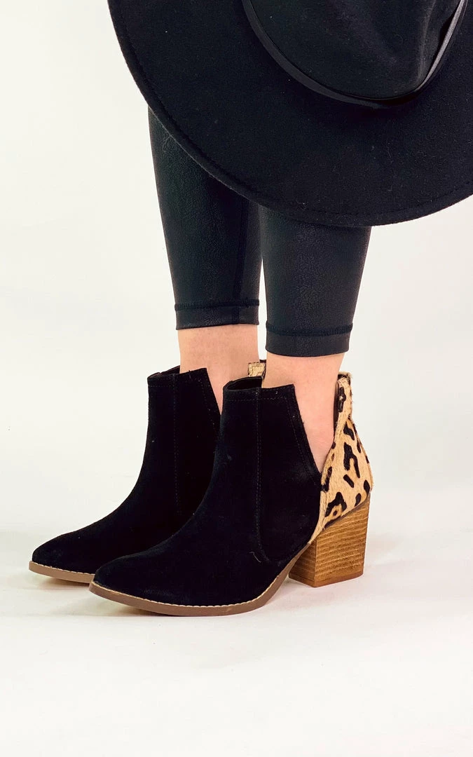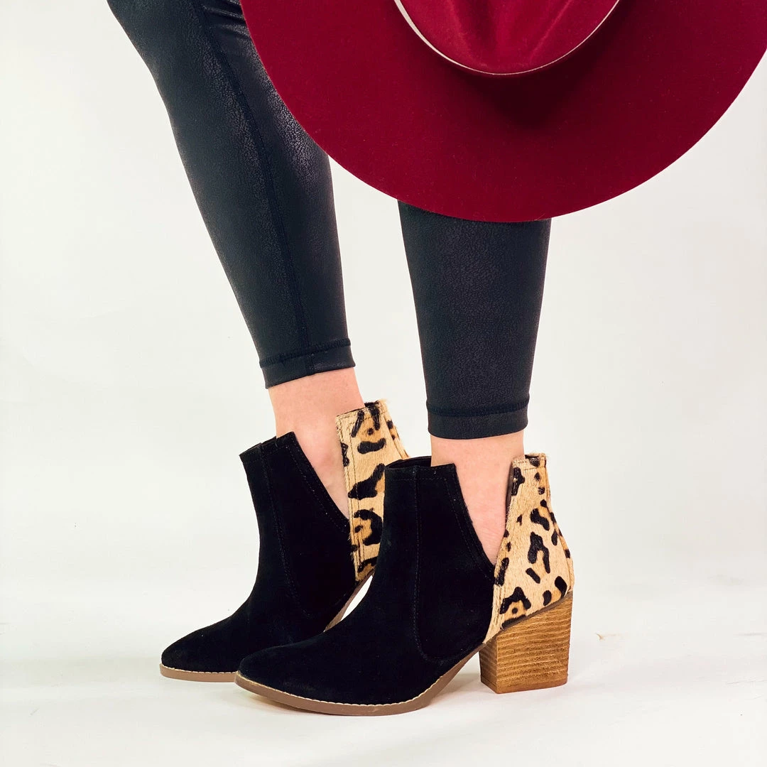 V-cut booties with a black upper and hair on hide, leopard print heel.
