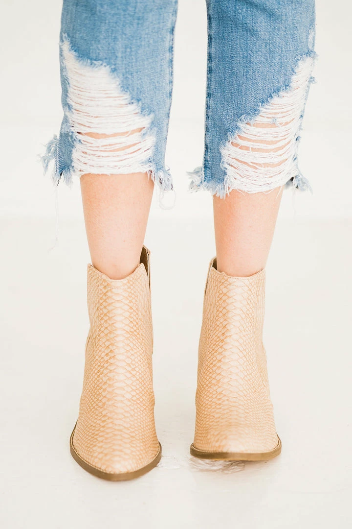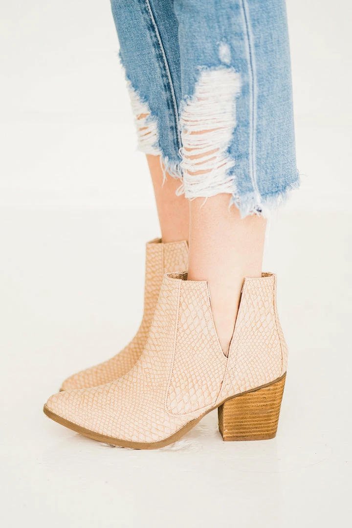 Our Tarim bootie has been a favorite time and time again! We now feature it in faux snakelike blush upper with a blonde heel.