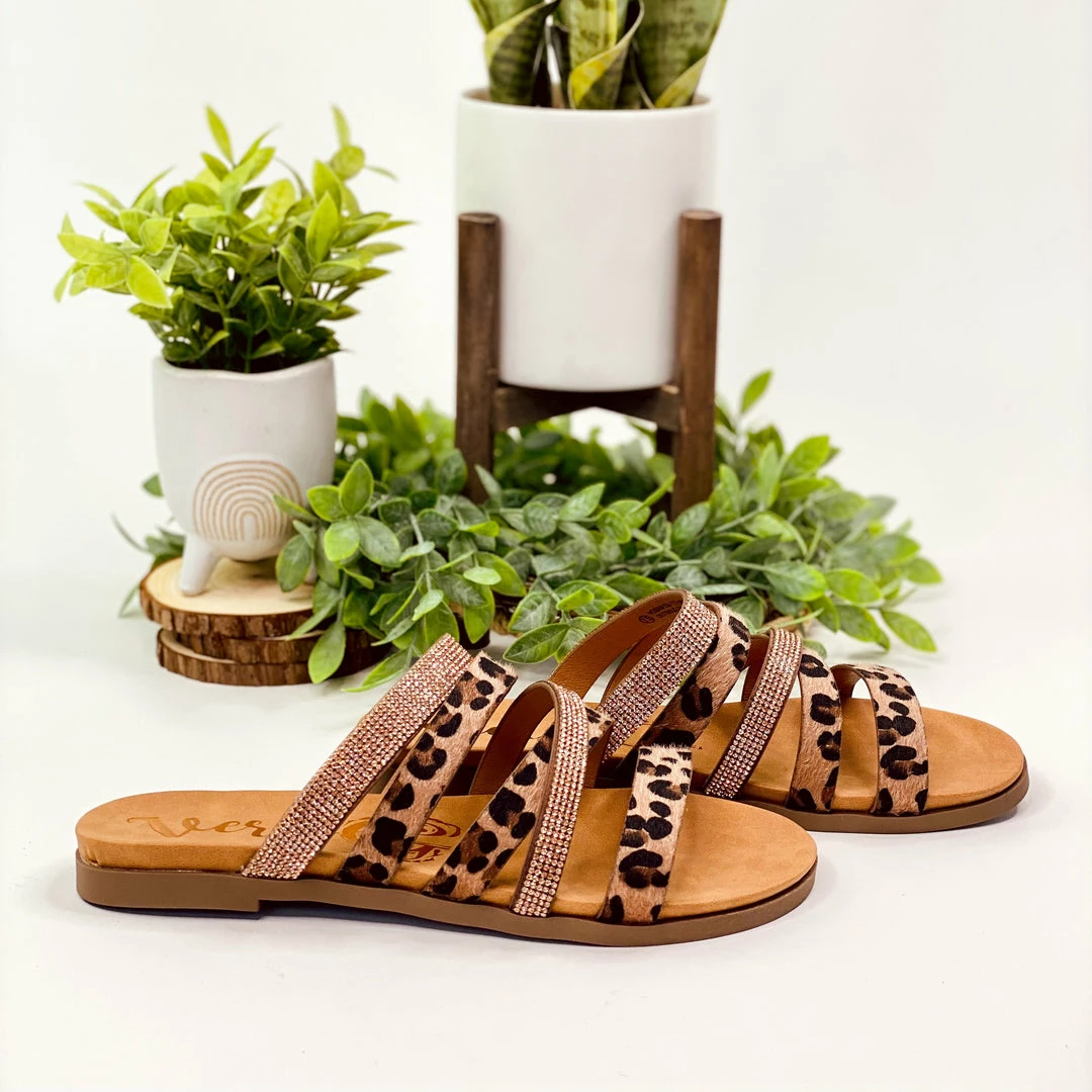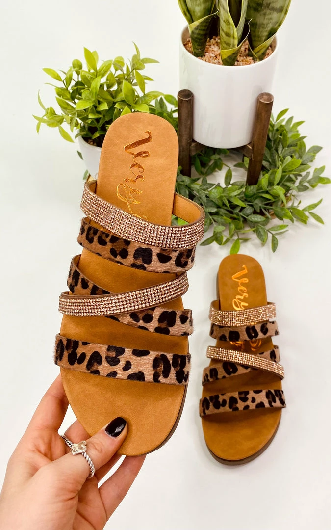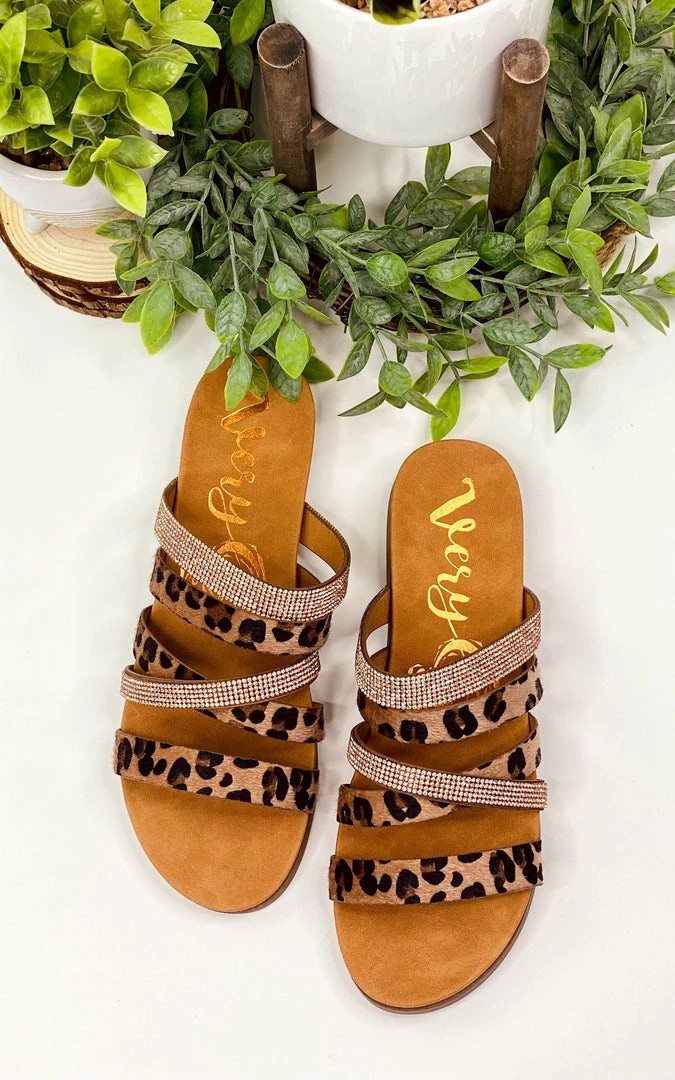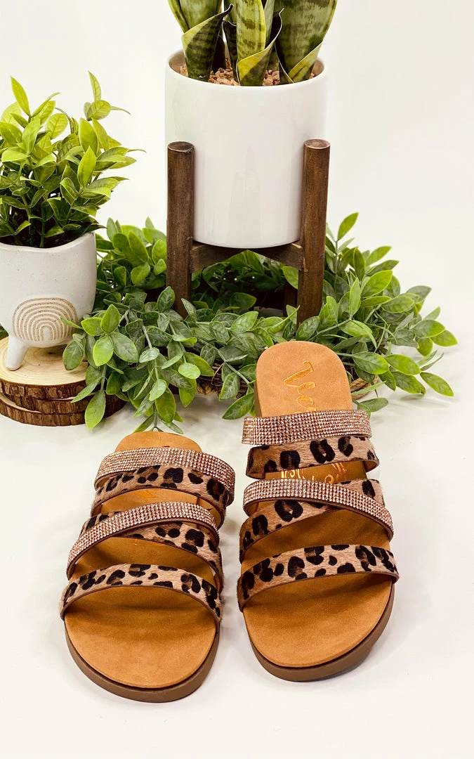 Multi pattern sandals with 5 straps. Leopard straps and beautifully alternate with rhinestone ones. Add a little glam to your everyday sandal!