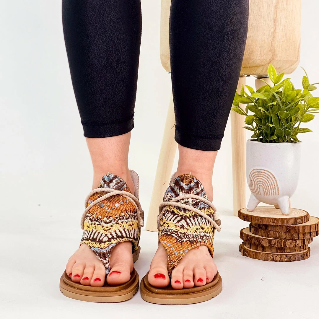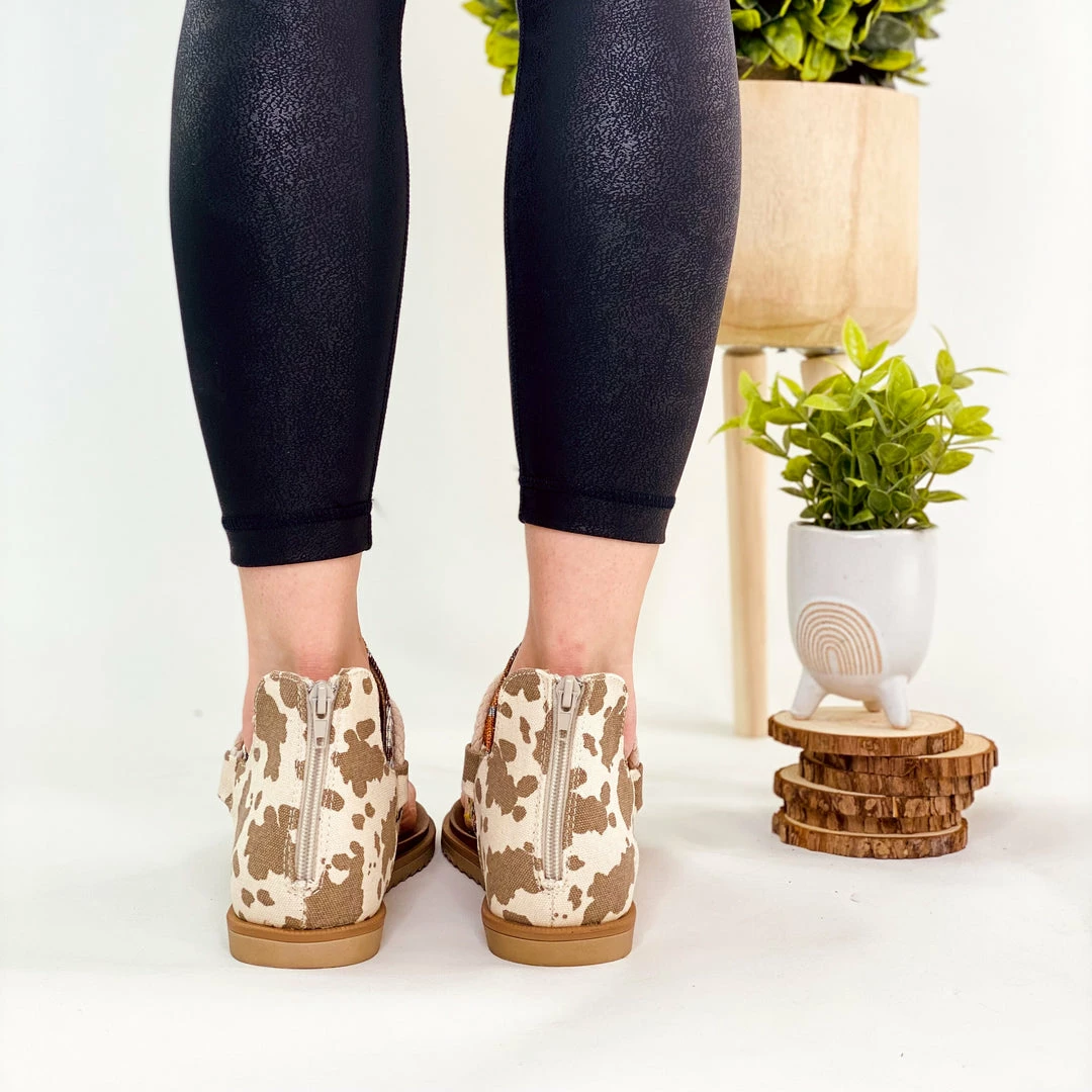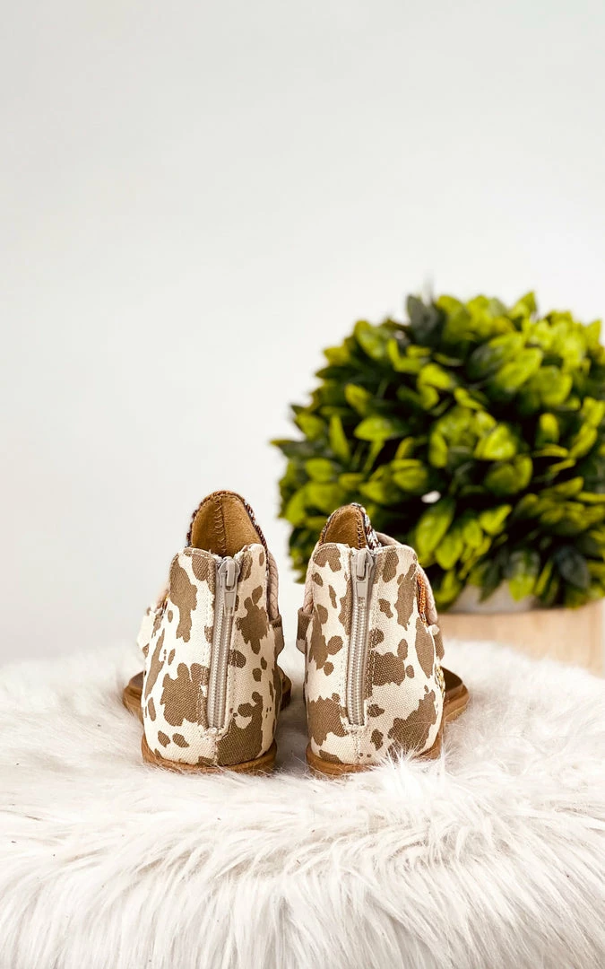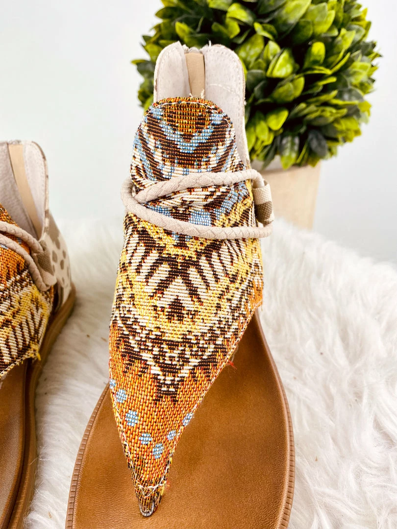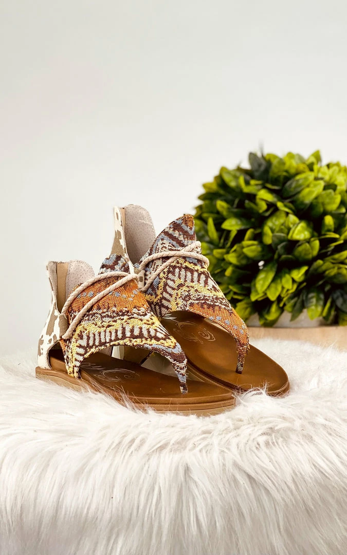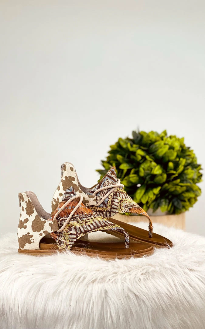 Awesome cream aztec canvas sandals with a tan cow print contrasting heel. These have the COMFIEST, contouring foot bed!