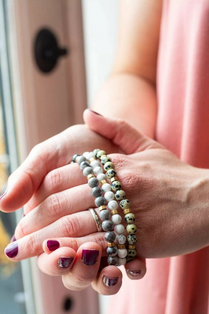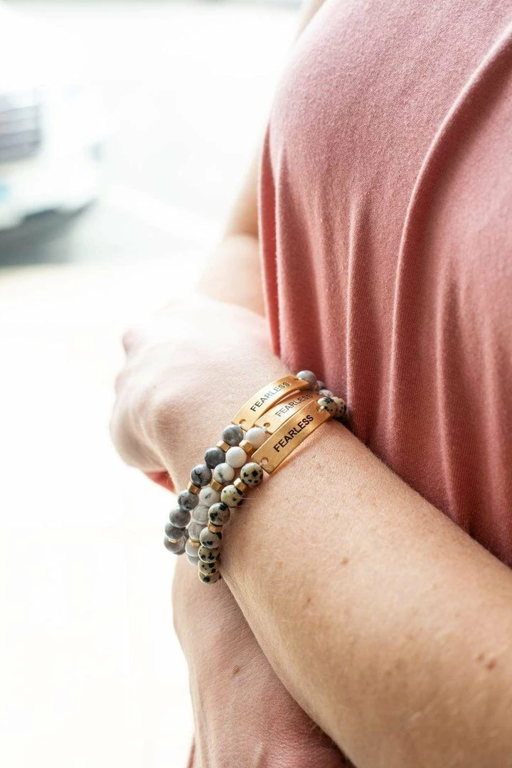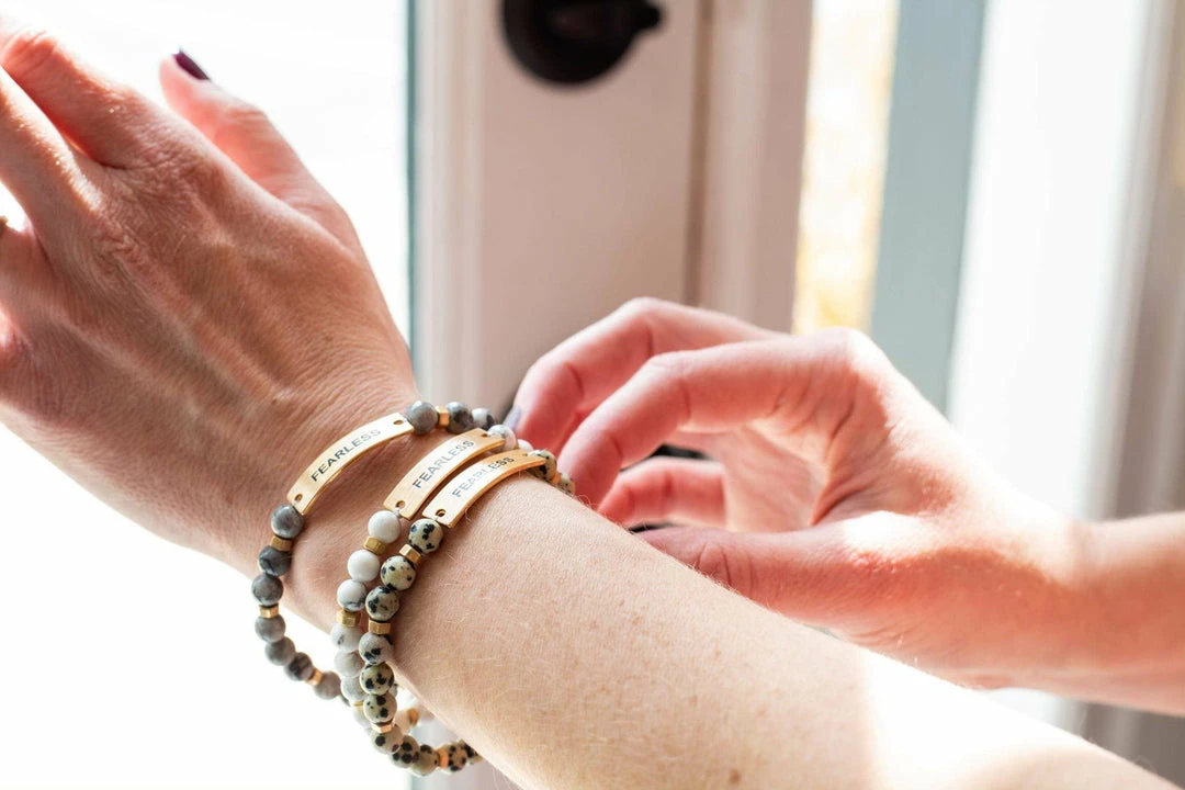 Inspirational stone beaded stretch bracelet with metal bar and word “Fearless”.