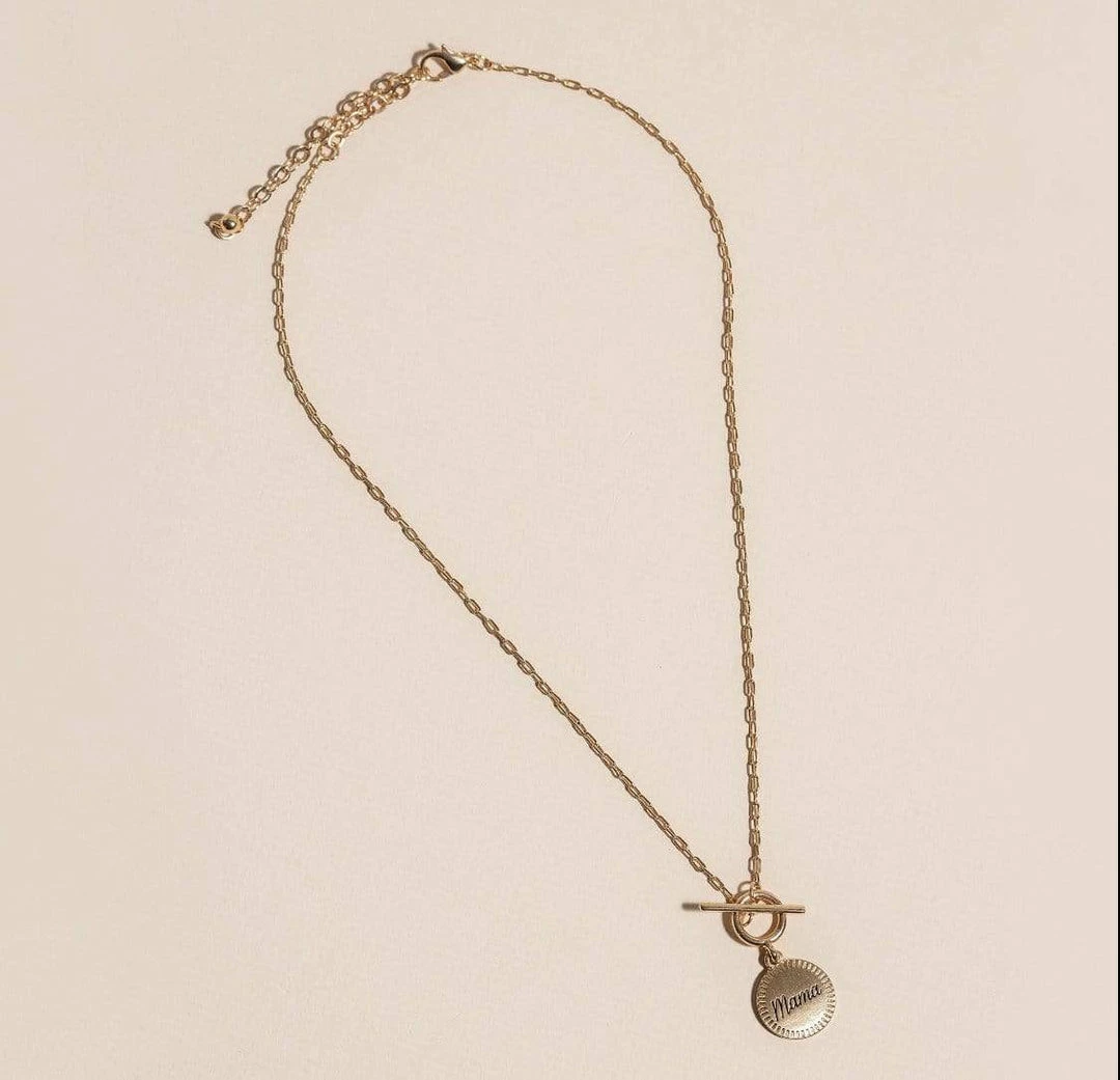 Inspirational toggle chain necklace with “Mama” coin charm.