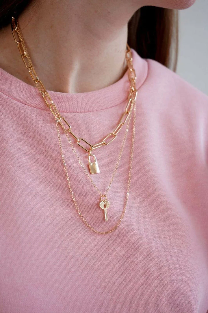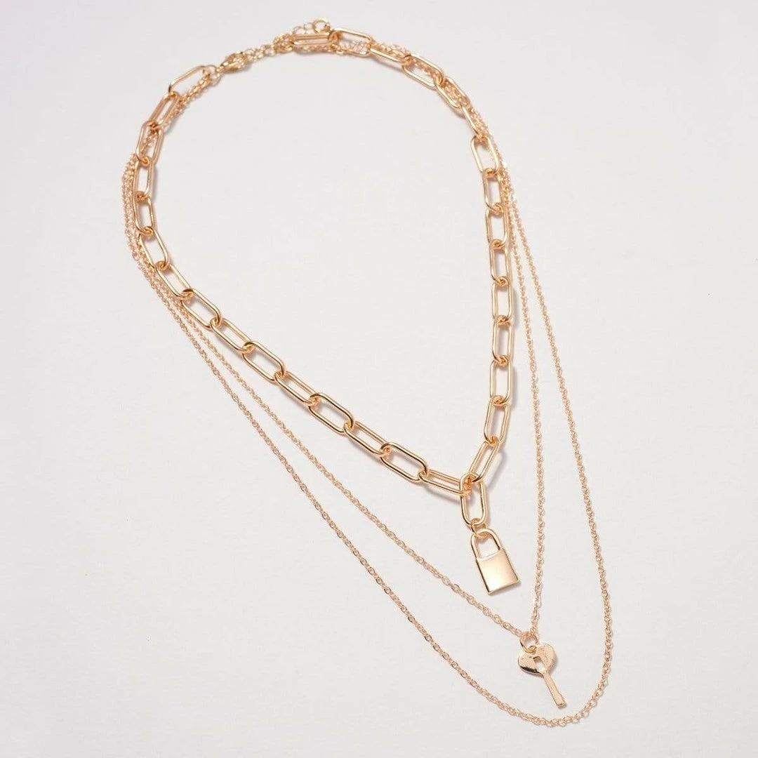 Triple layered necklace with lock and key charms. Approx: 18-24″ Material: Zinc, Brass Gold and rhodium plated, Lead Compliant, Nickle Free