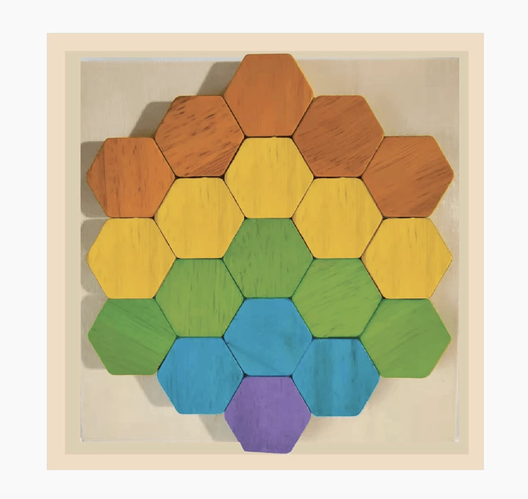 The possibilities are endless with this fun patterning hexagon matching puzzle and game all in one! All of our toys are cleverly designed to nurturing kids intelligence development, exploring ability and STEM Skills. This hexagon matching game contains 19 pieces, a wooden storage tray, and a double sided card with 18 different matching cards!