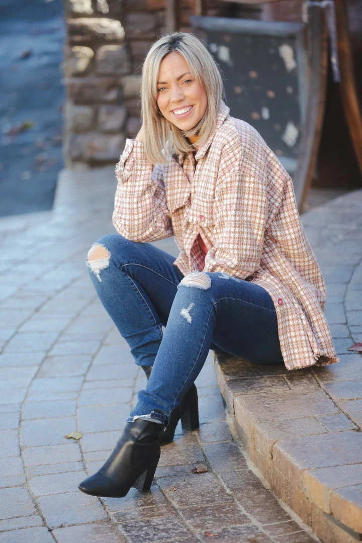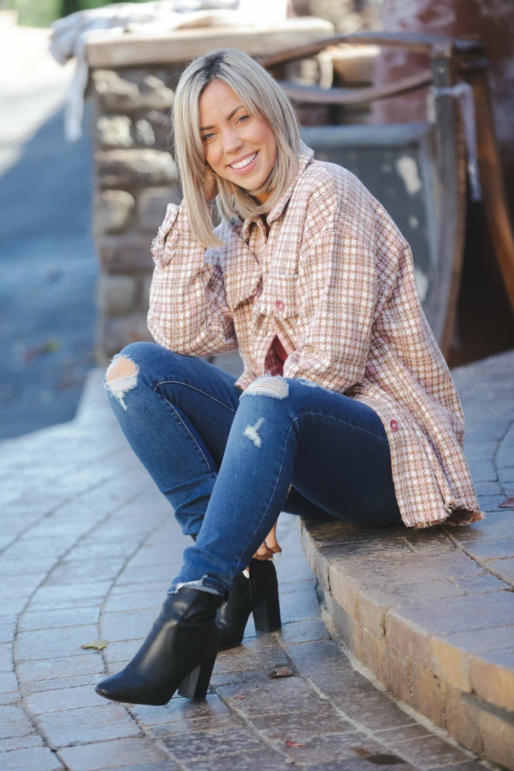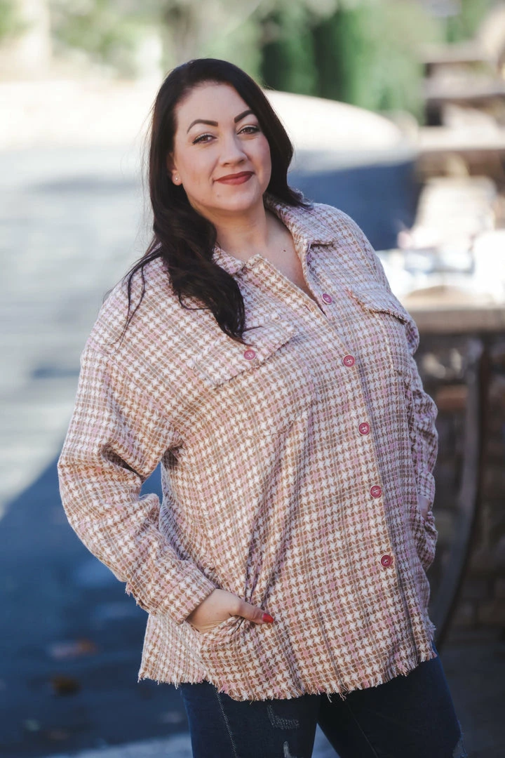 OMG this jacket is THE perfect transitional jacket. The pink and taupe colorway will allow you to seamlessly spring into Spring in style! With a relaxed fit, this jacket features a rounded raw hem, button enclosure and front utility pockets.