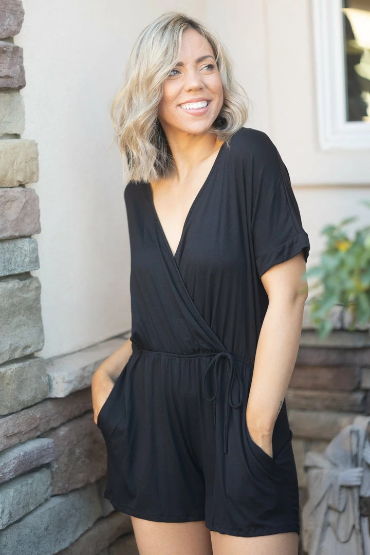 The only romper you’ll ever need and your closet is screaming for you to make this one yours! Featuring a comfortable relaxed fit, with elastic waistline, faux wrap v-neck top, short sleeves and pockets!