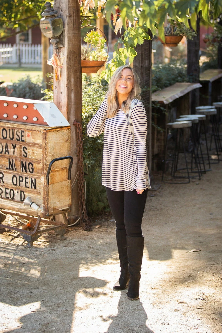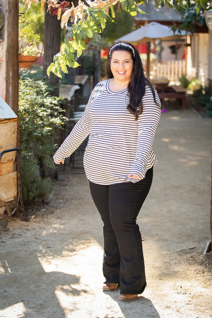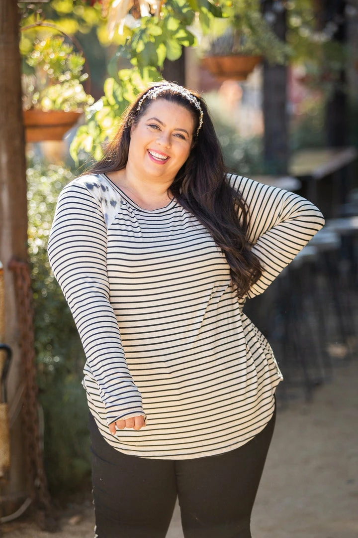 We are in love with this striped long sleeve top. The contrasting tie dye really gives the stripes the perfect break to not overwhelm the eye. Featuring long sleeves a round neckline and added tie dye back panel, this is the perfect unique addition to your wardrobe.
