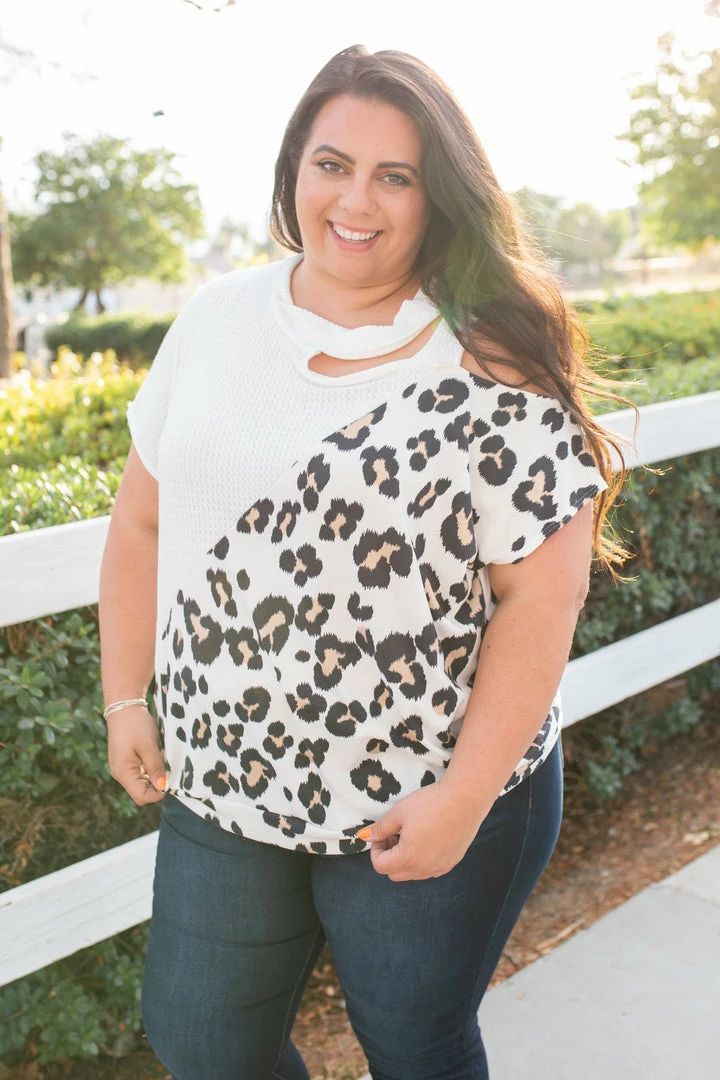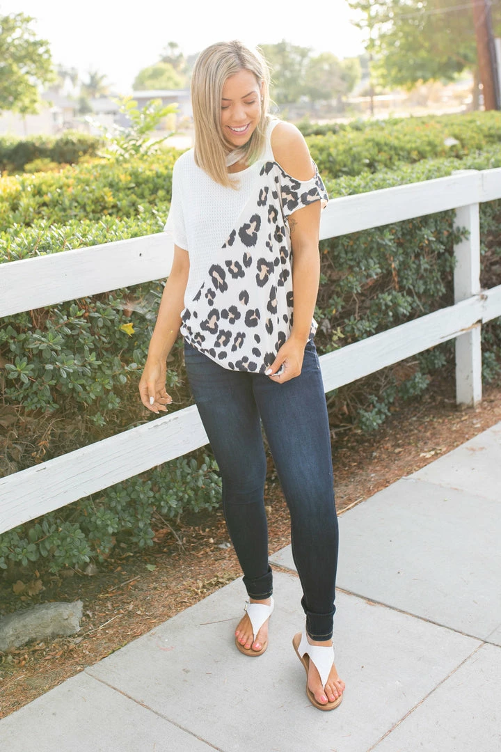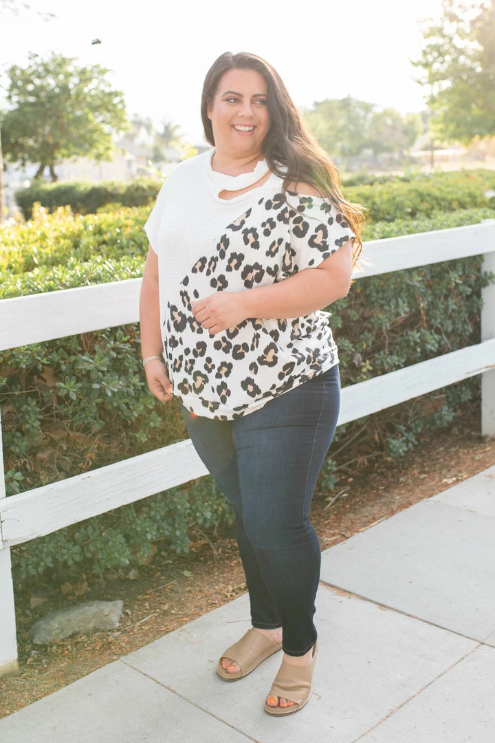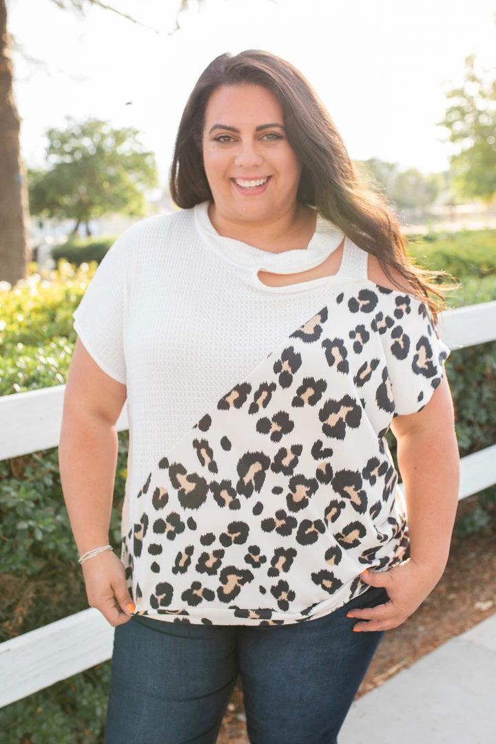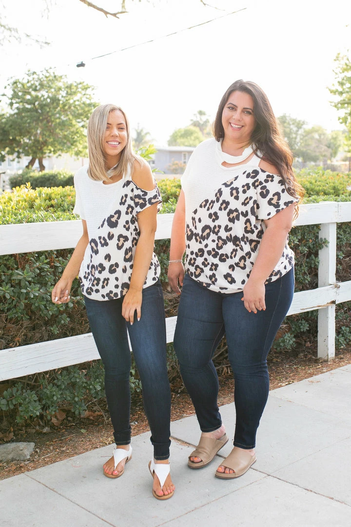 Let your wild side shine in this amazing short sleeve top. Featuring a relaxed fit, short sleeves with an open shoulder and strap detail. This top will be the perfect unique addition to your wardrobe.