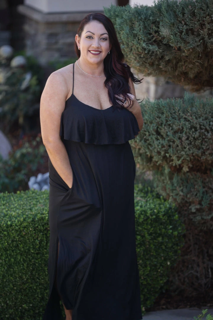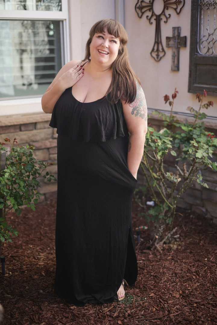 Let your beauty unleash in this effortless, classy and comfortable maxi dress. Made from the softest jersey material, this maxi features side slits, a ruffled tiered bodice, criss cross back detail and pockets!
