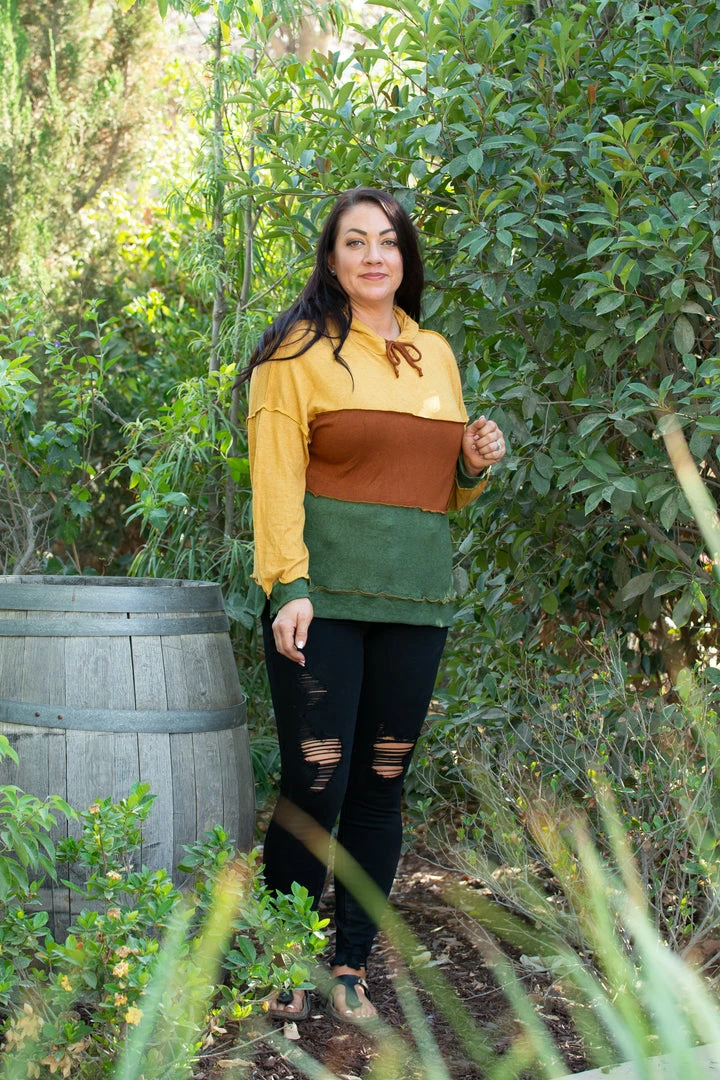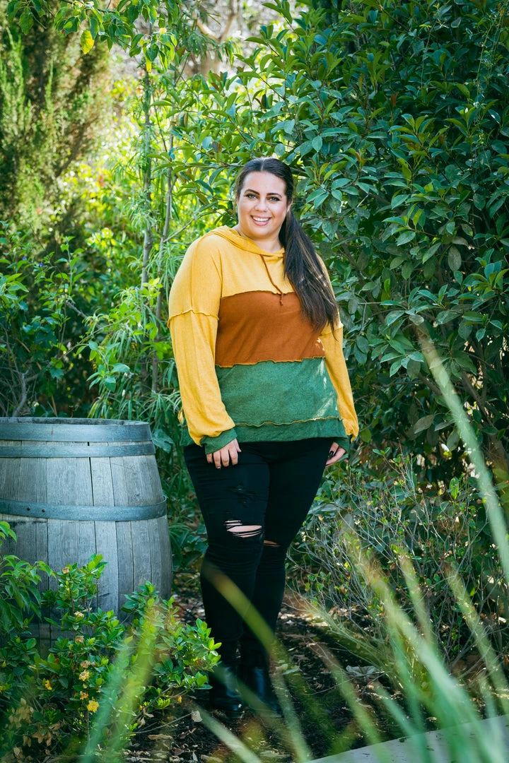 It’s all about the journey with this amazing color block hoodie! The most amazing part is that reverse stitching separating the blocking. With a relaxed fit, this hoodie features long sleeves, functioning drawstring hoodie and hi low hem.