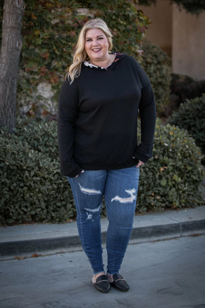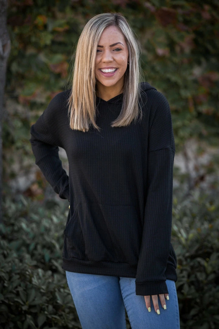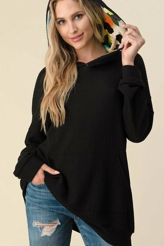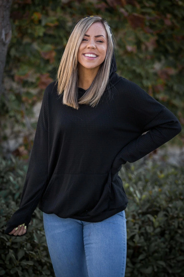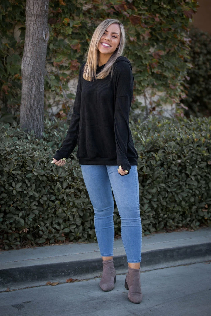 This waffle knit hoodie is absolute life! We are loving the pop of color the hoodie lining gives to this solid black top. Not only is it amazingly soft and cozy, but it also has pockets!