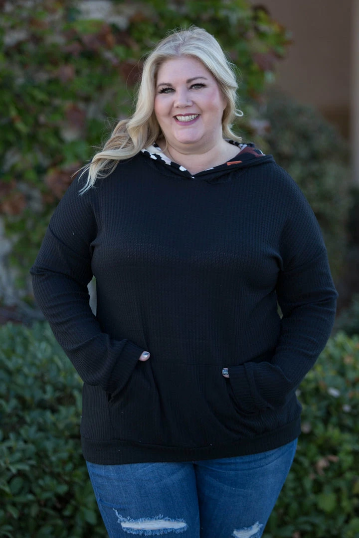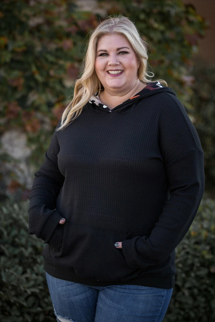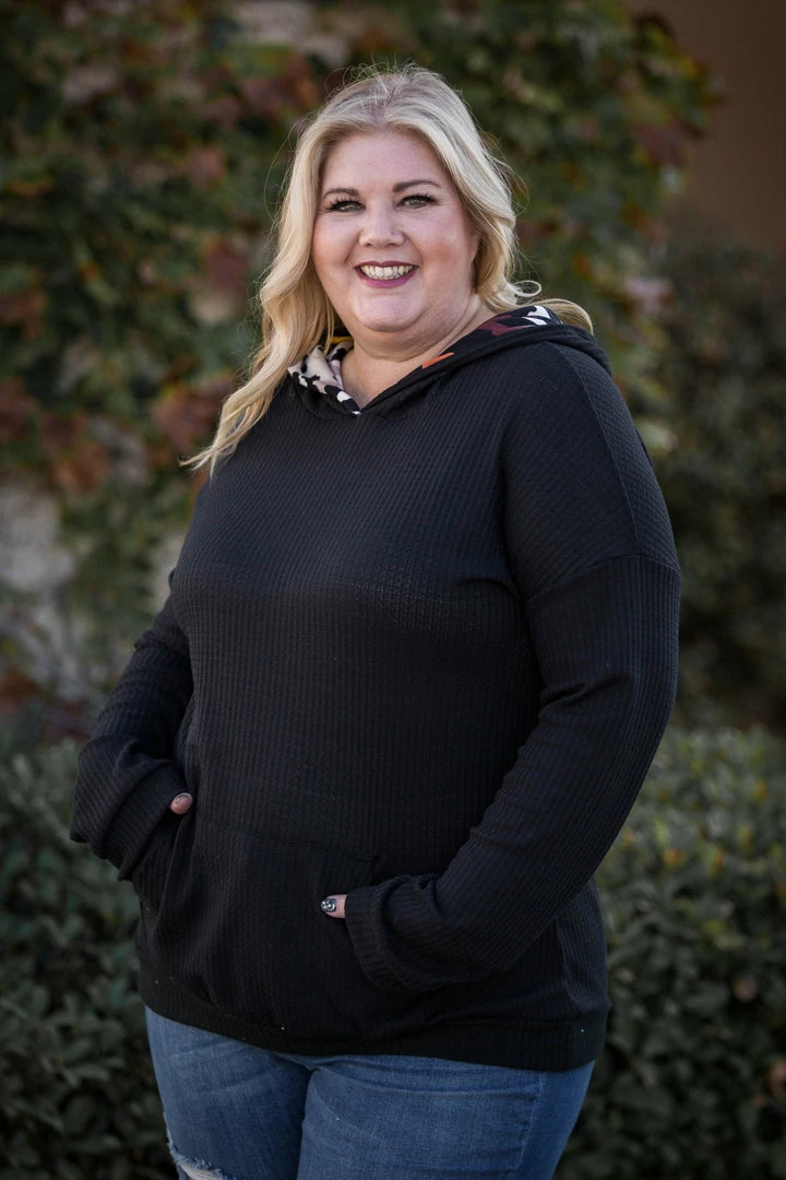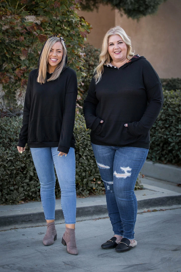 This waffle knit hoodie is absolute life! We are loving the pop of color the hoodie lining gives to this solid black top. Not only is it amazingly soft and cozy, but it also has pockets!