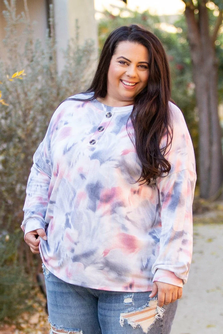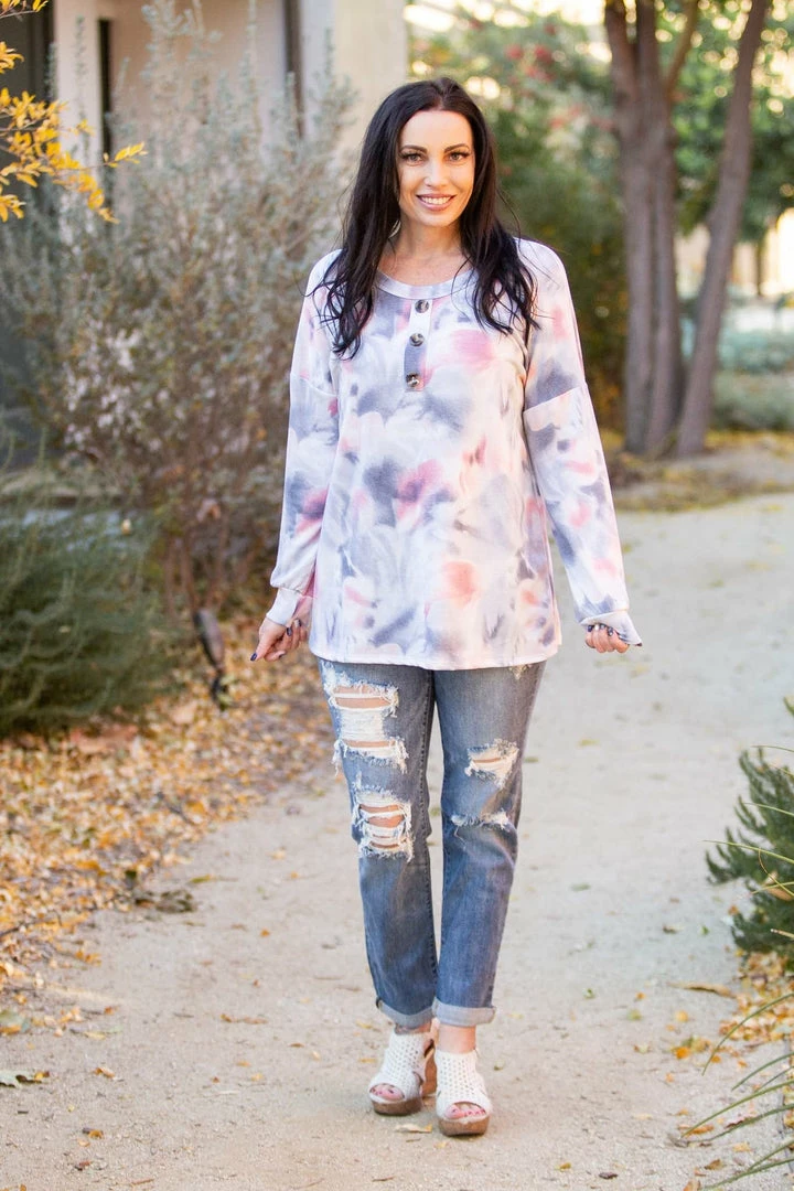 There’s just something so angelic about the colors in this long sleeve top. Featuring long sleeves, a relaxed fit, round neckline with faux buttons, this top will make all your dreams come true.