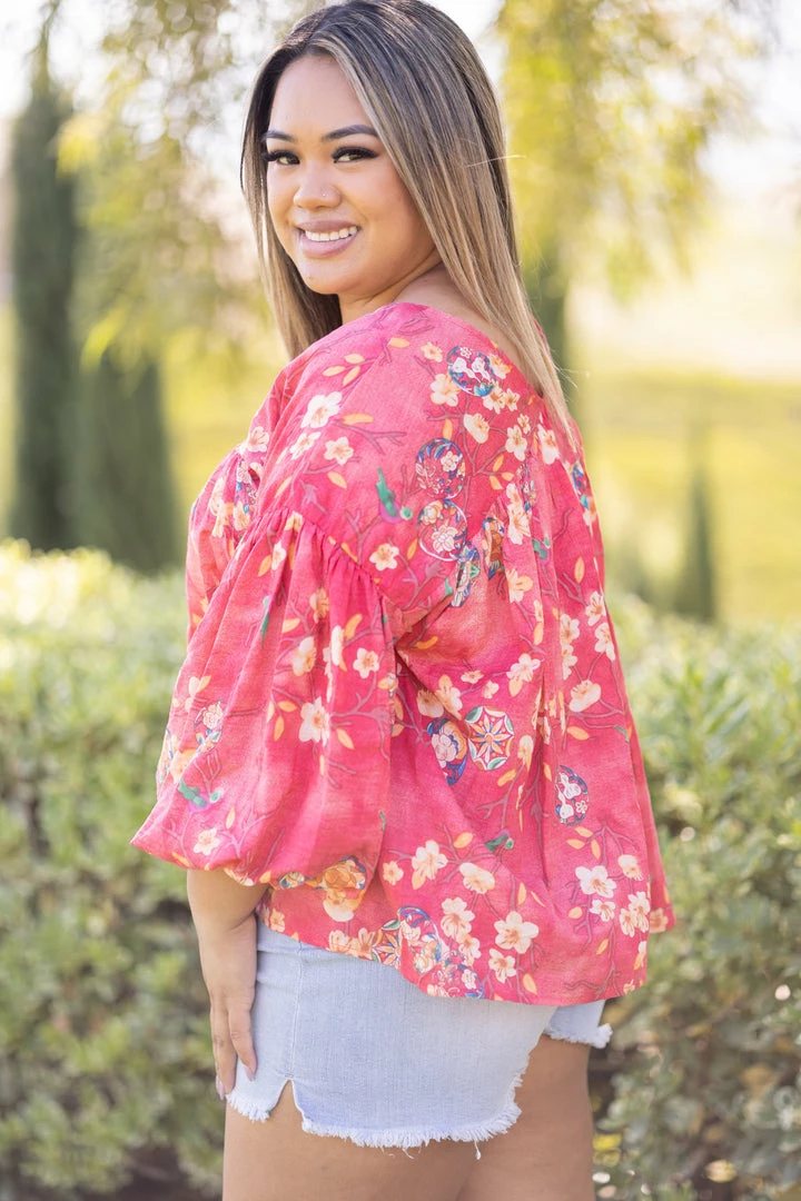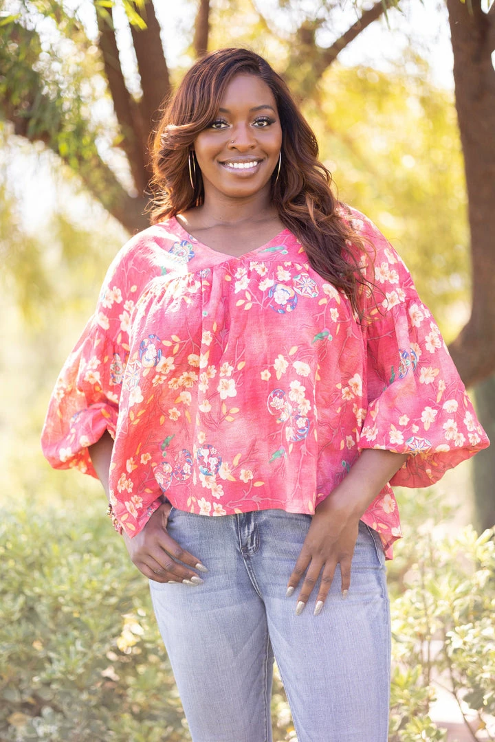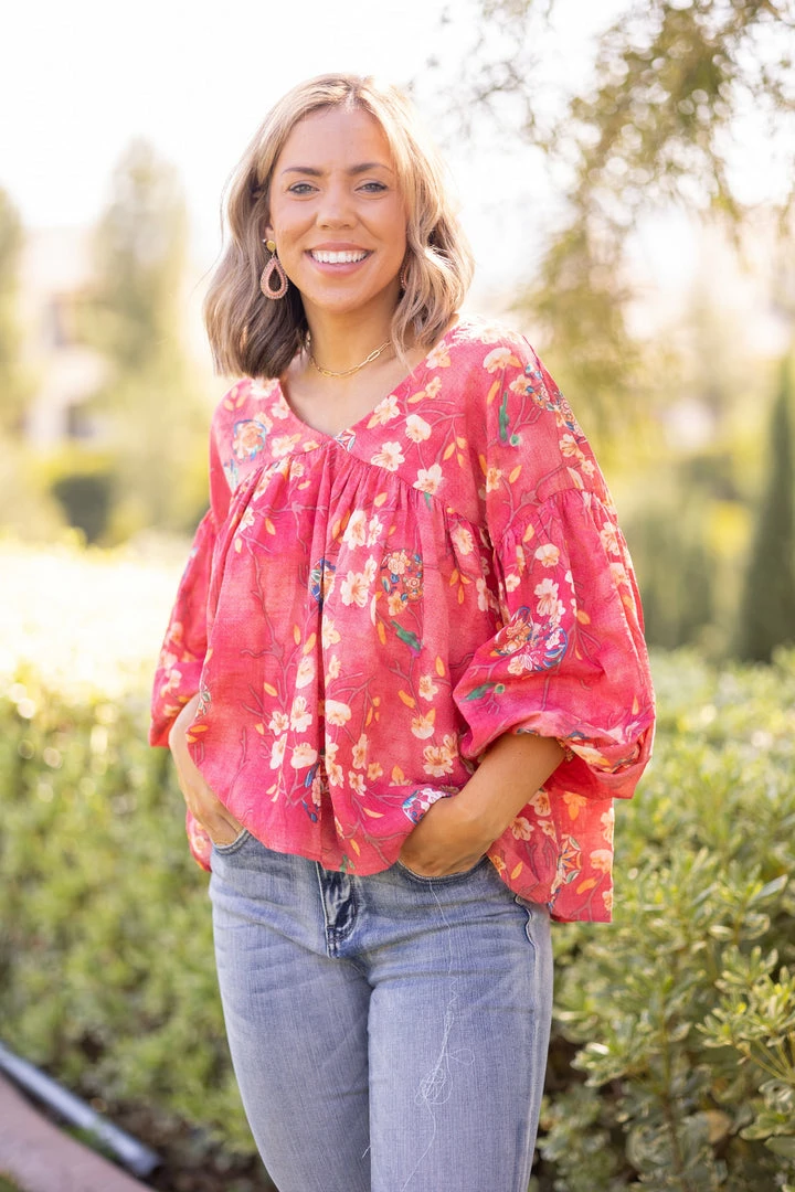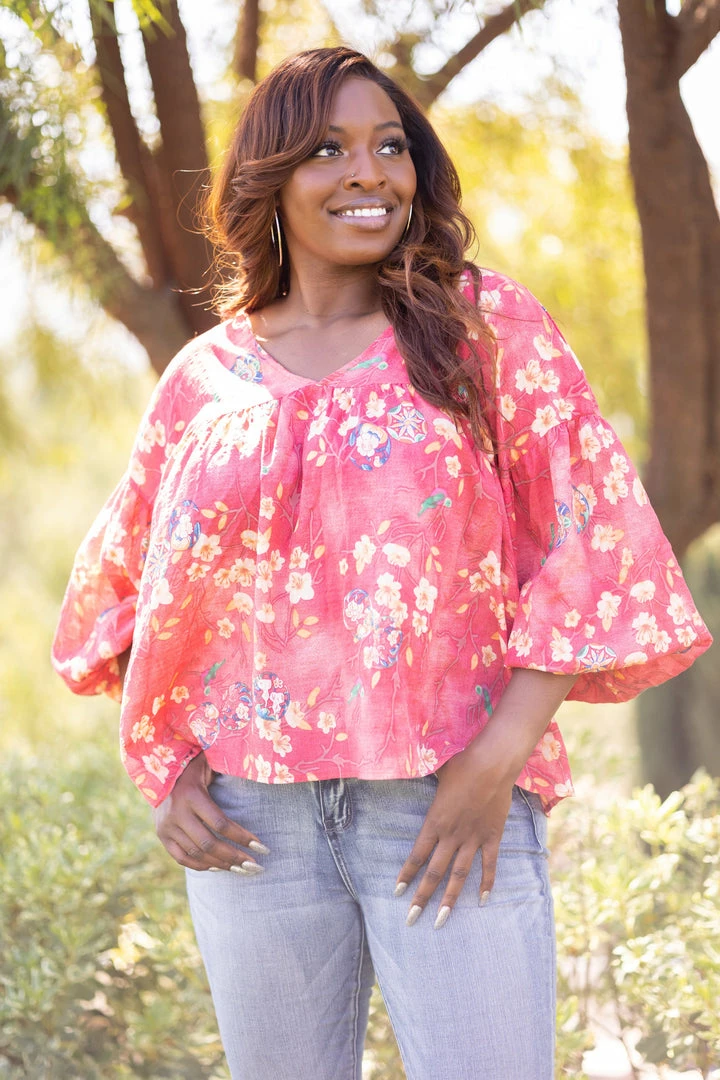 This floral printed woven babydoll is perfect for a day at the office or an evening out. With a relaxed fit, this top features a v-neck, long ballon sleeves with elastic cuffs and hi low hem.