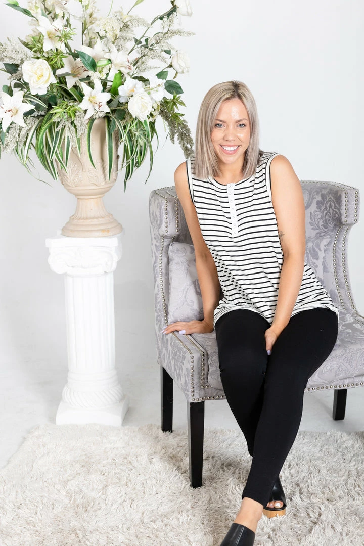 You can never go wrong with black and white stripes, it’s such a classic look and pairs so well with so many things. With a relaxed fit, this top features a round neckline with functioning snaps down the front.