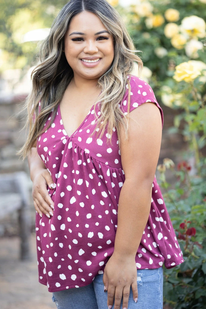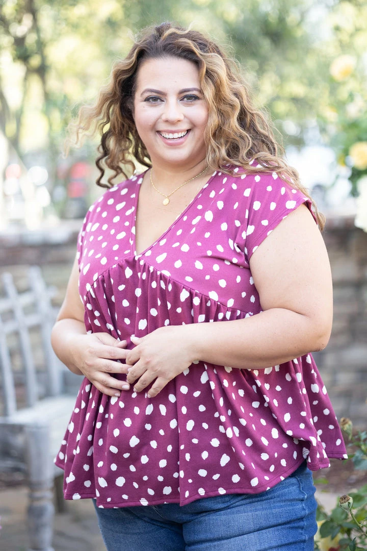 This ultra soft spotted babydoll is the perfect addition to your wardrobe. Made from the softest oakley fabric, this top features a relaxed fit, drop shoulder short cap sleeves and v-neck.