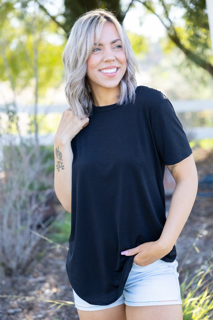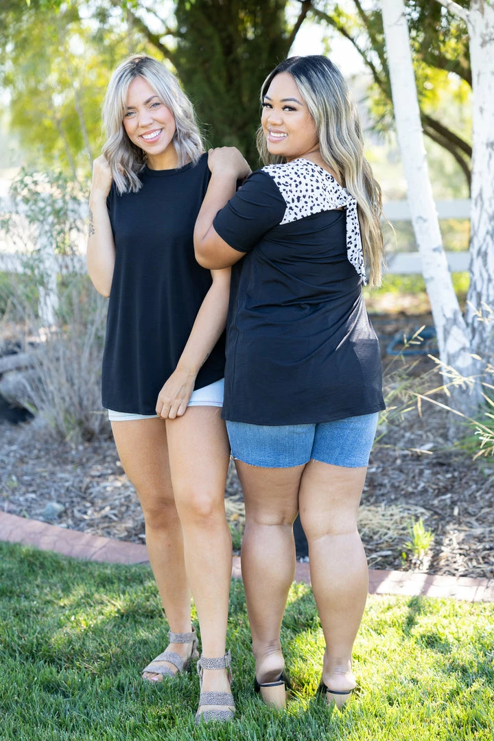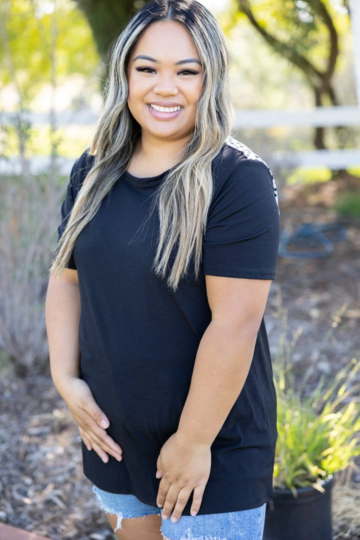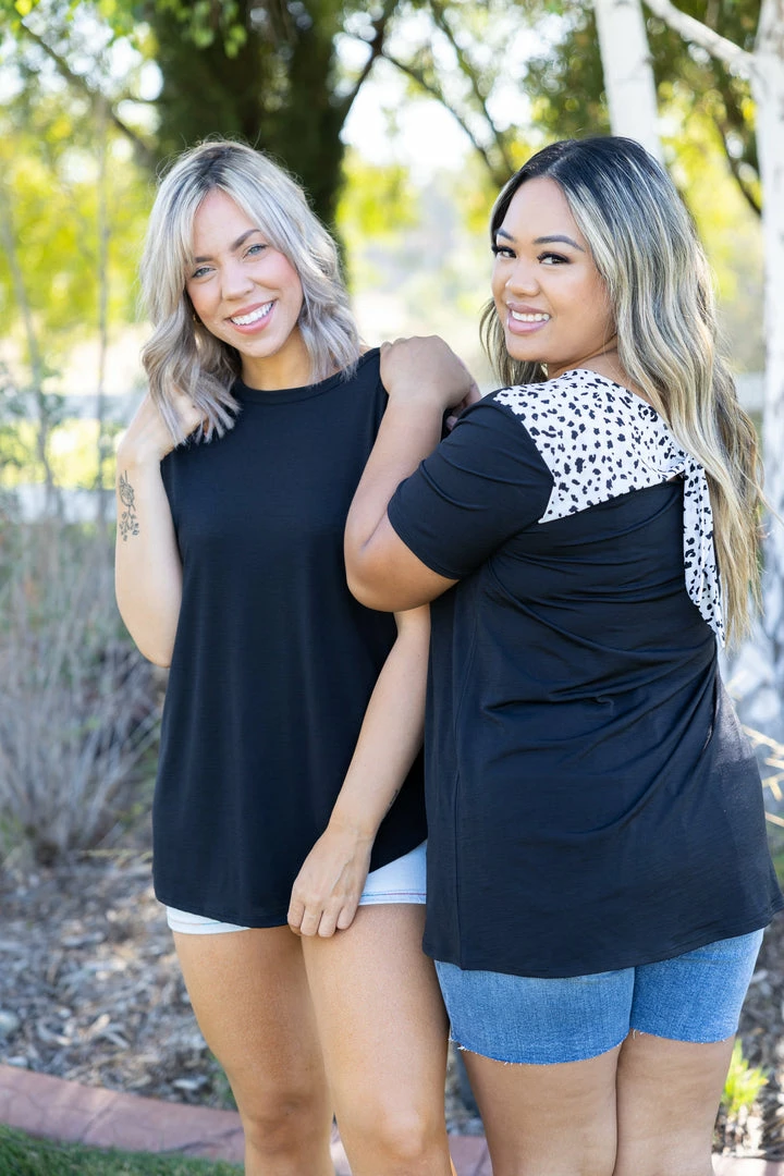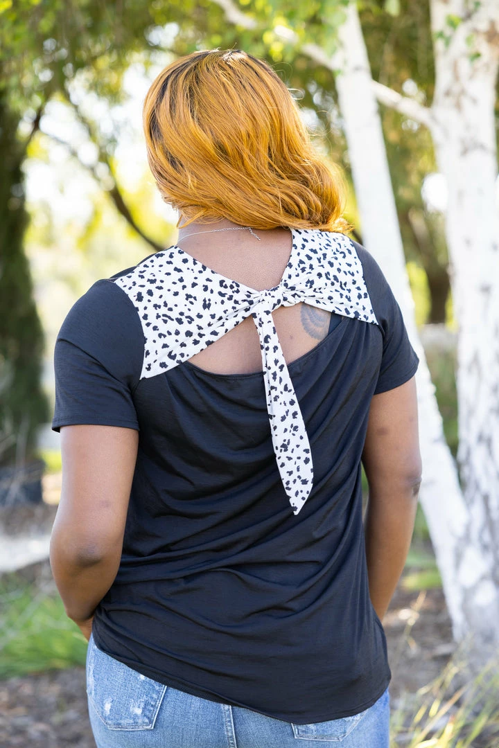 We are loving this fun take on a classic black short sleeve top. The animal print back panel, that self-ties, really gives this piece a unique look. With a relaxed fit, this top features a round neckline, short sleeves and rounded hem.