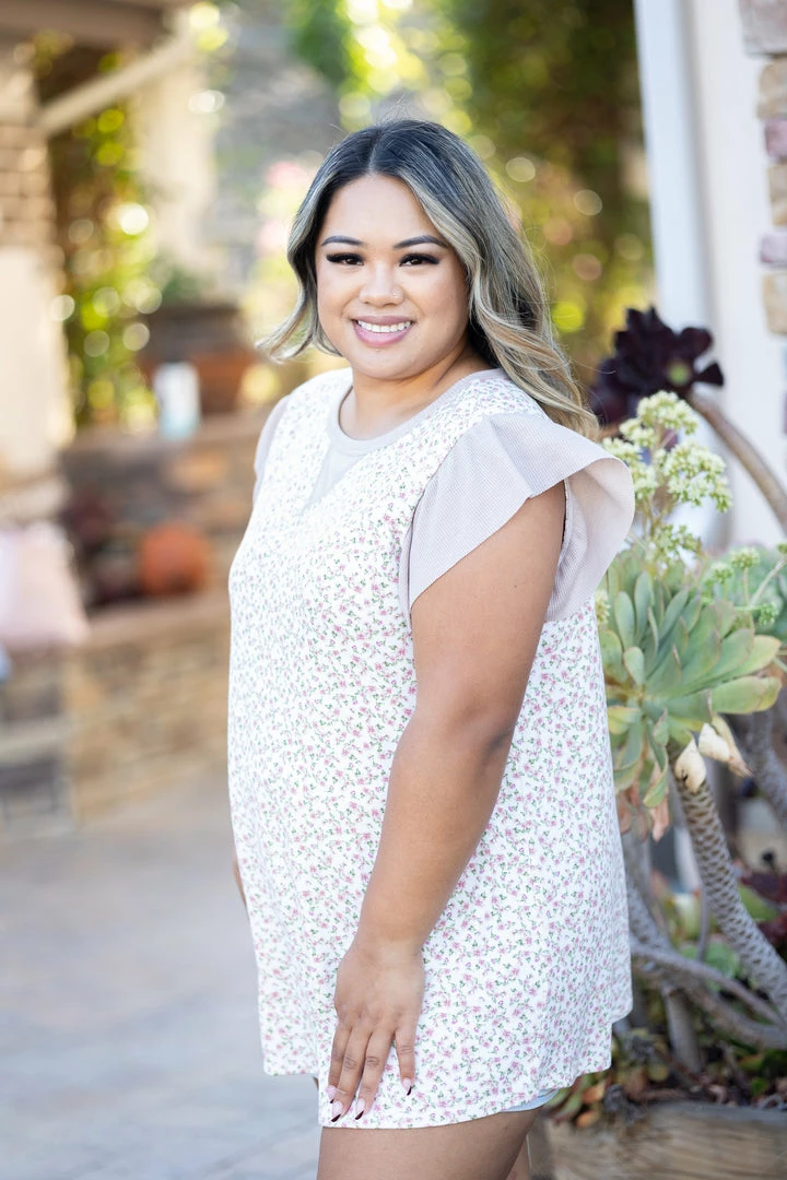 There’s just something so special about those small floral prints that have us swooning. This top features a round neckline, short ruffled sleeves, a rounded hem and reverse stitch detailing.