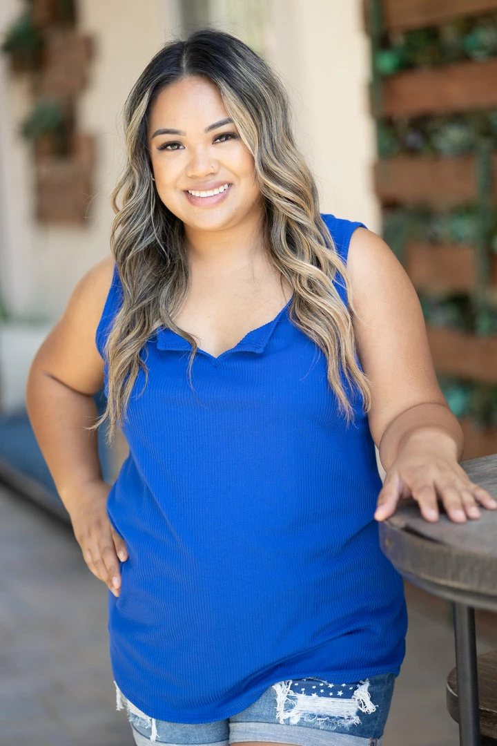 This slightly ribbed sleeveless top is the perfect piece to wear alone or layered under your favorite blazer. With a relaxed fit this top features a square neckline with notched cutout and rounded hem.