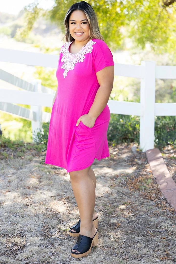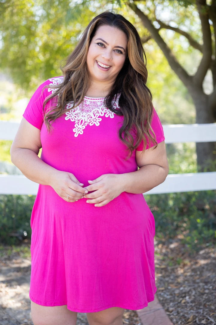 This dress will absolutely become your forever loved and cherished every day dress. The crocheting detail really makes this dress effortless and easy to dress up or down with. With a relaxed A-line silhouette, this dress features short sleeves and POCKETS!