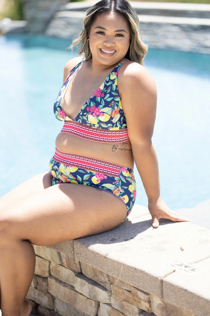 This two piece swimsuit will become your go to swimwear of the season. The high waisted printed bottoms are perfect for every body shape and the classic triangle cut top features adjustable straps to best fit your body.