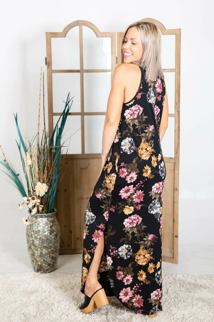 The floral print in this stunning maxi is to die for! We are loving the color combinations on that black background. With a relaxed fit, this top features a round neckline and rounded hem with side slits.