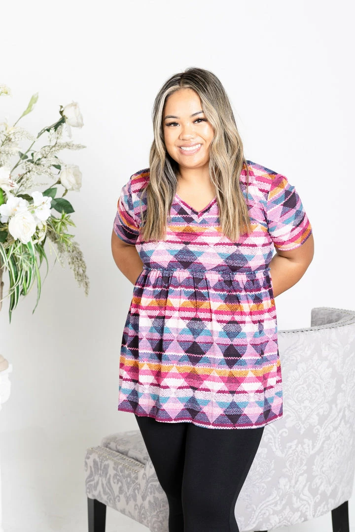 This vibrant Aztec printed babydoll is one of our absolute favorites. With a relaxed fit, this top features a V-neck, short sleeves and rounded hem.