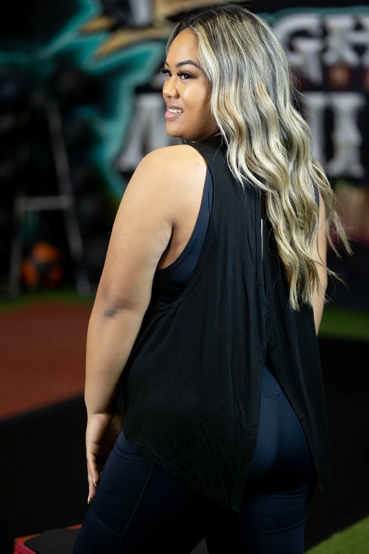You will feel totally balanced in this sleeveless open back tank. Literally the perfect shirt to run around town in or hit the gym with…either way you’re going to look stylish. With a relaxed oversized fit, this top features a round neckline with cutout back detail.