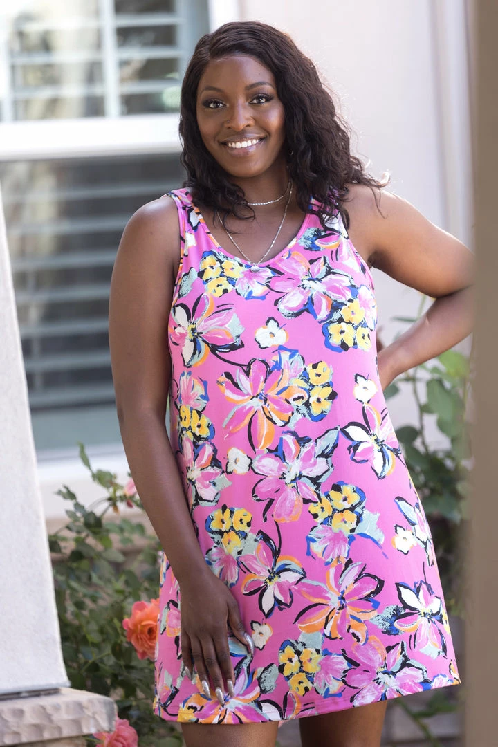 Step into a tropical bliss with this buttery soft swing dress. With the classic a-line silhouette, this dress features a scoop neck and back v with a round hem.