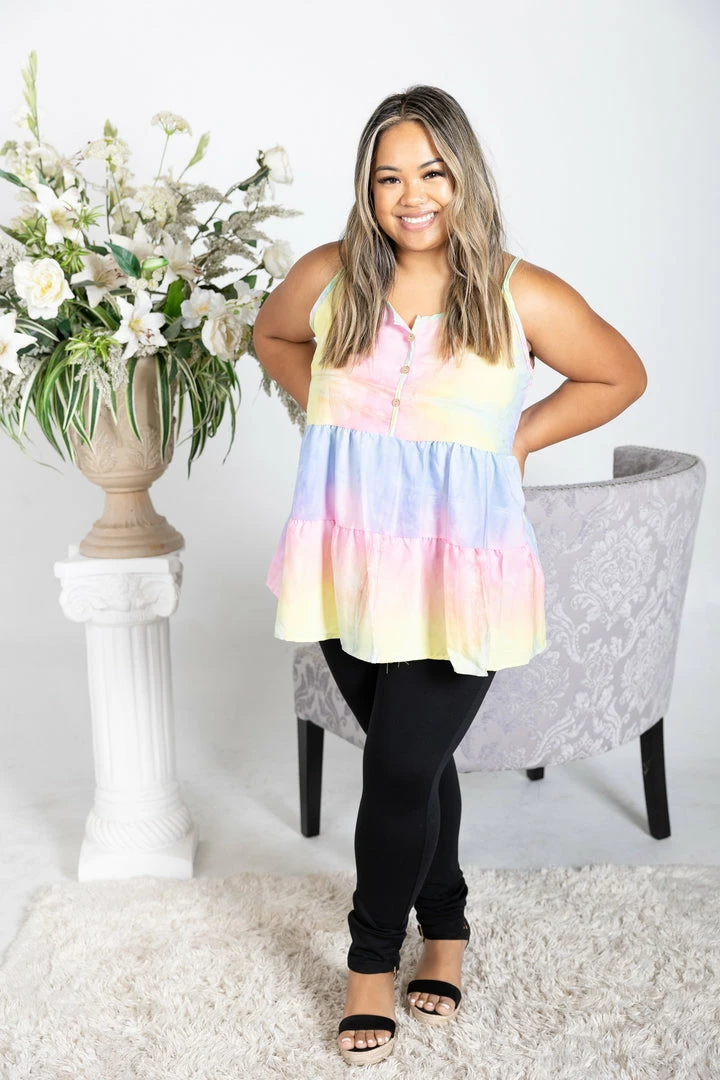 This tie dye tanks makes us want to turn up the music and live our best life. With a relaxed fit, this top features a round neckline with faux button details and tiered ruffled hem.