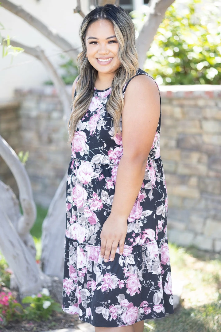 The perfect summery dress! The vintage roses on the black background and the lightweight fabric make us think of endless summer fun. With a relaxed fit, this dress features a round neckline an tiered ruffled hem.