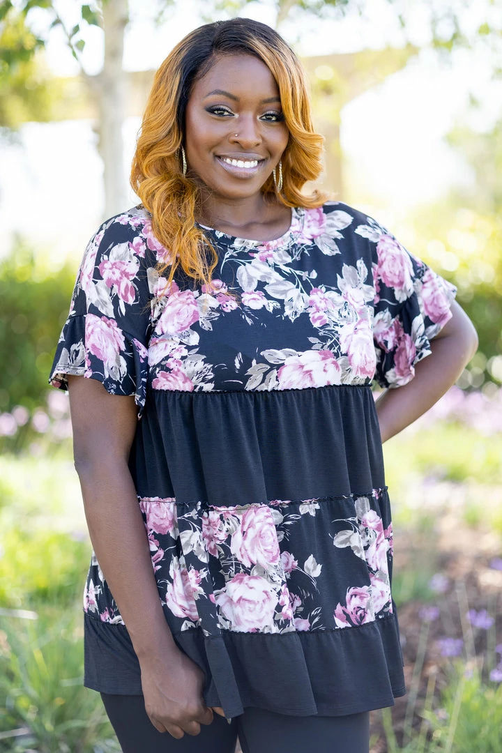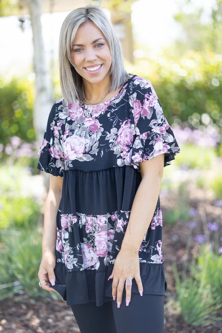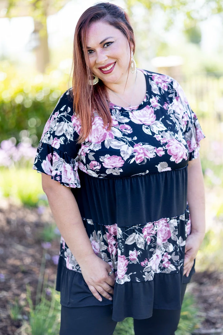 Love is a vintage rose, and we are swooning over this black and floral color-block tiered tunic. With a relaxed fit, this top features a round neckline, short ruffled sleeves and tiered ruffled hem.