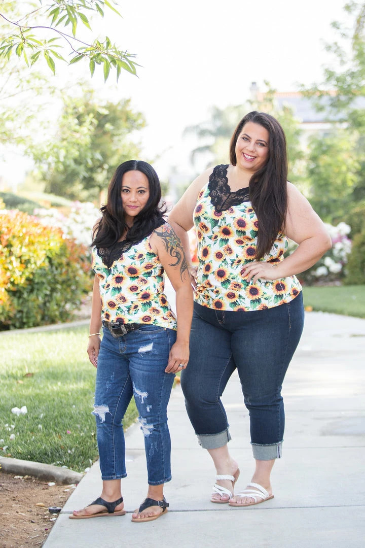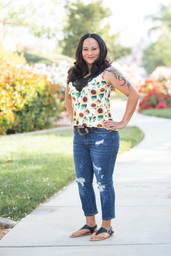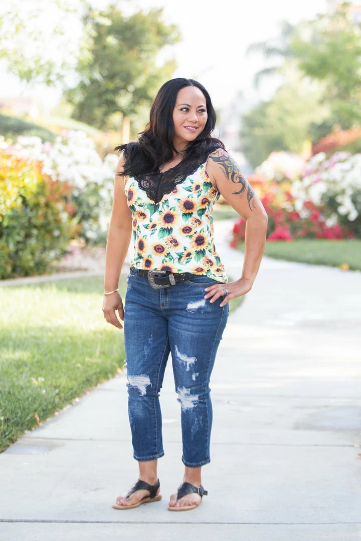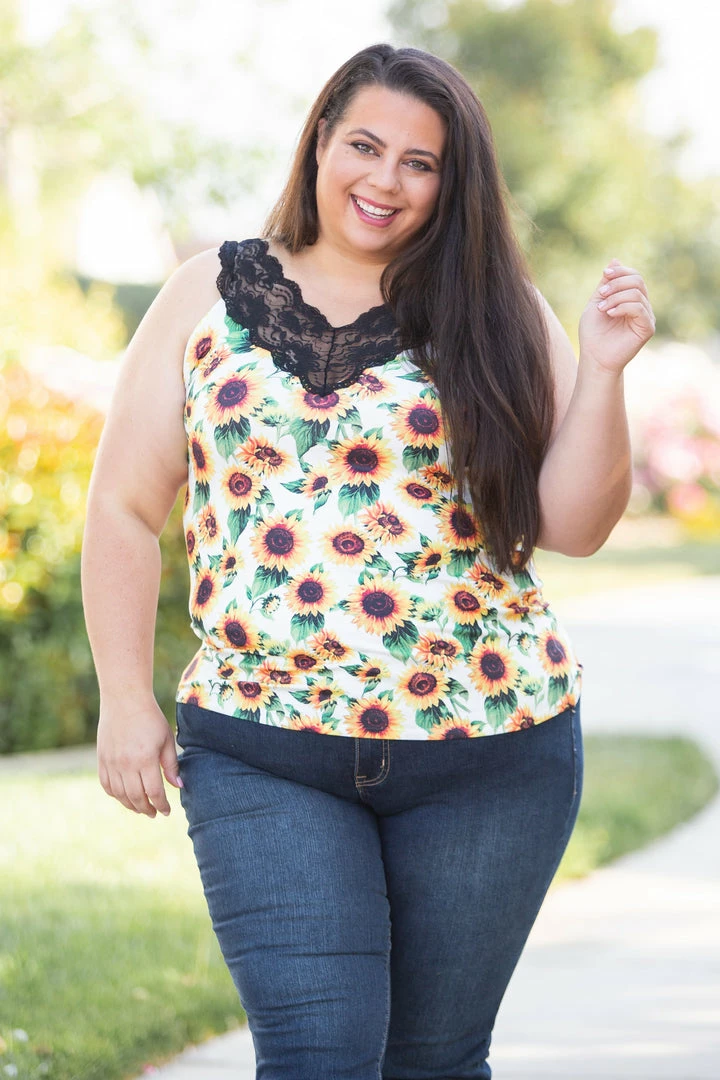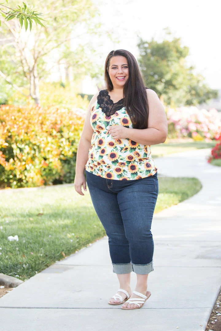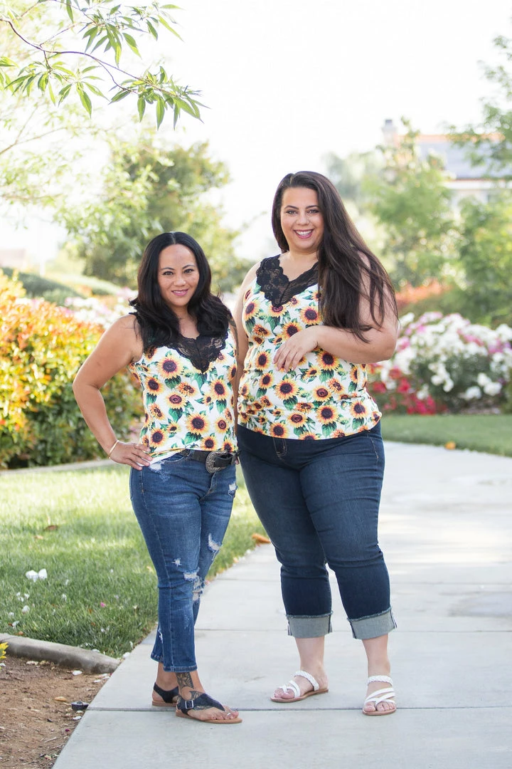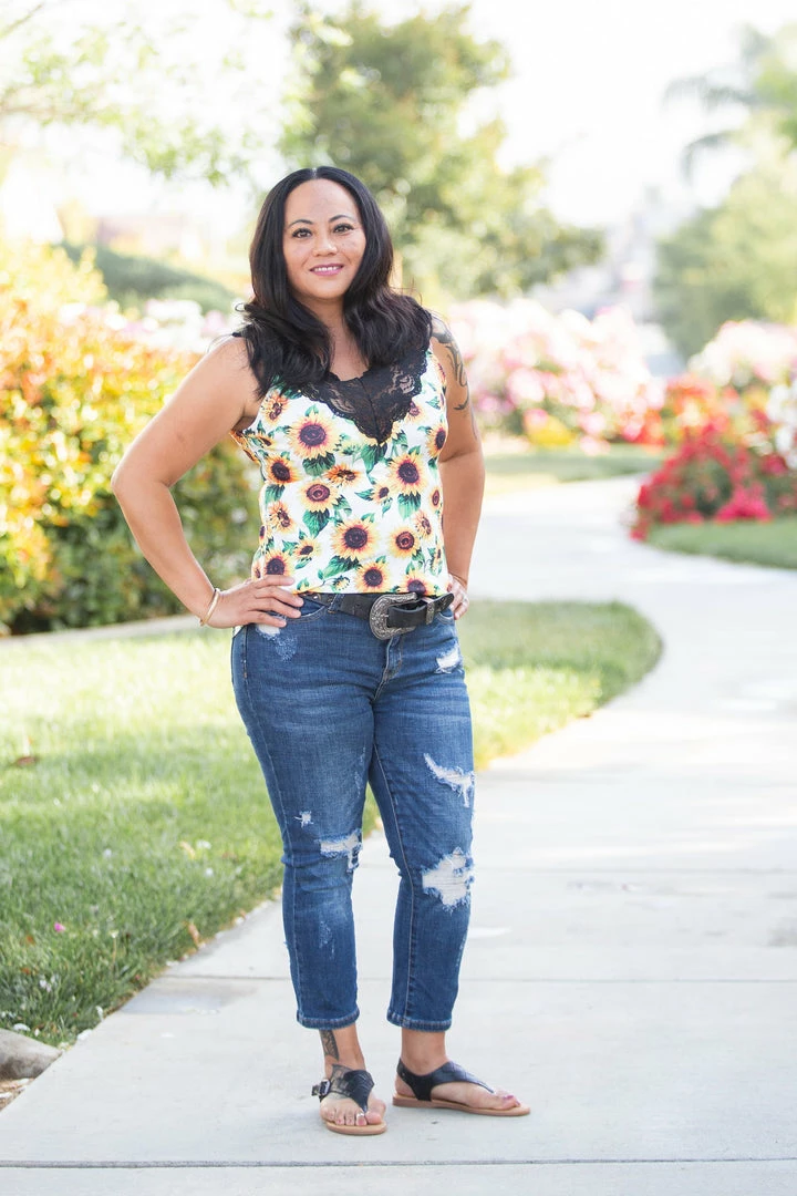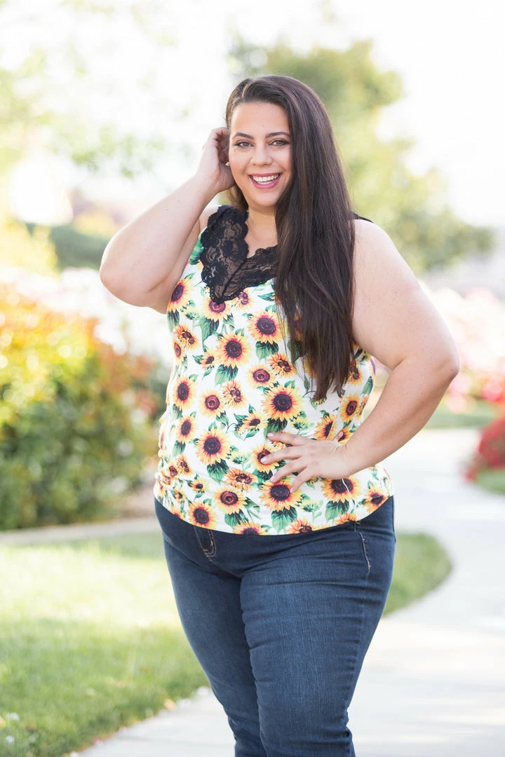 Don’t worry, be happy! This sunflower tank gives us all those happy feels. Made from buttery soft baby suede, this top features a semi fitted frame and a v-neck with lace trim.