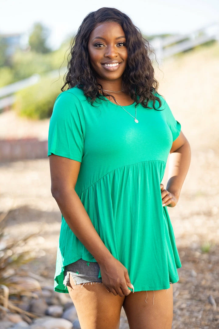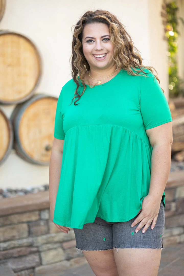 Be my, be my baby doll. This is the perfect everyday wear in the most amazing Kelly green color. With a relaxed fit, this top features a round neckline, short sleeves and curved hem.
