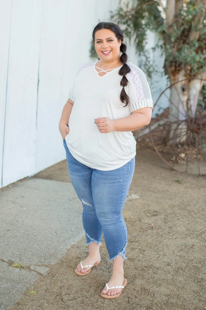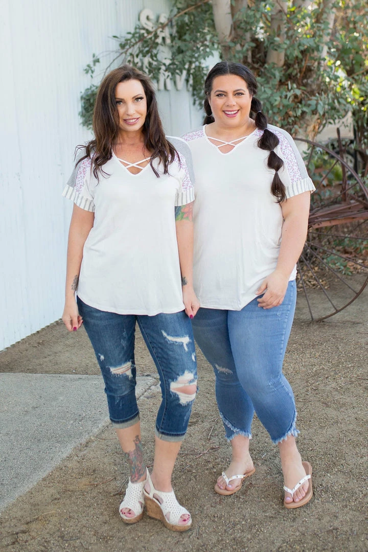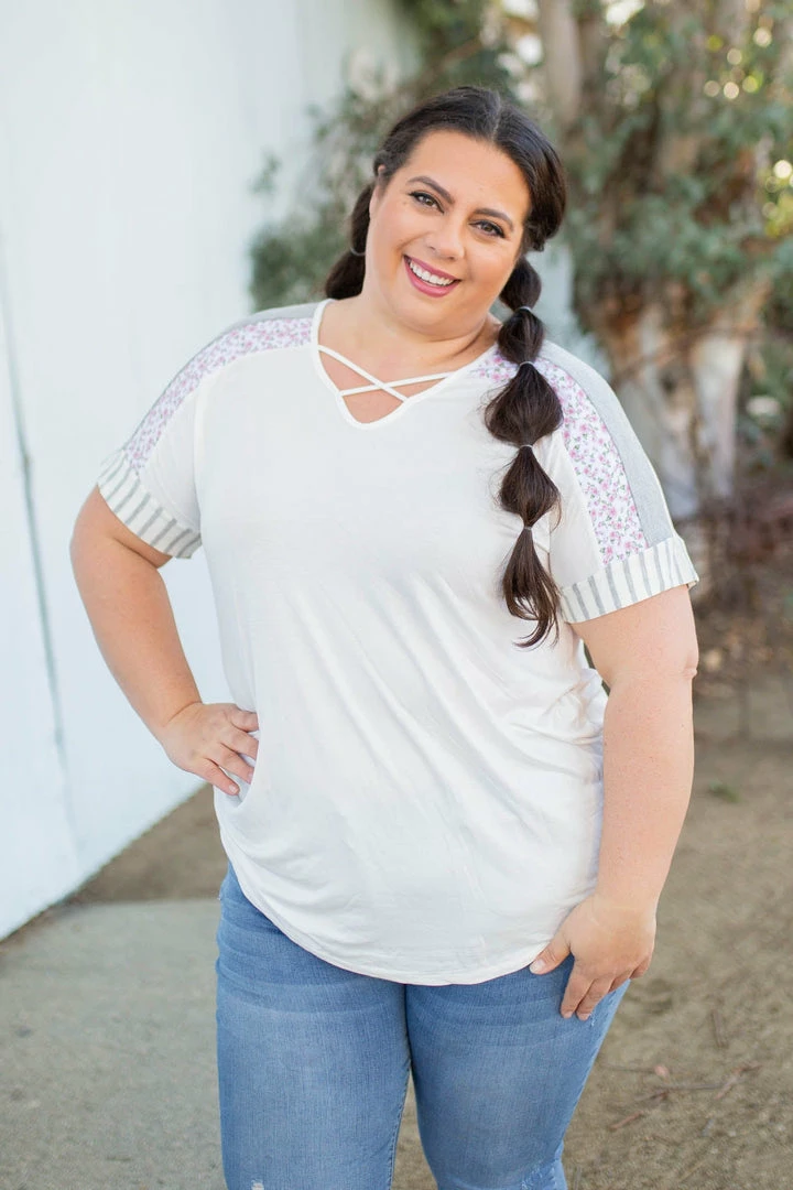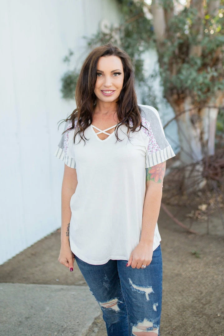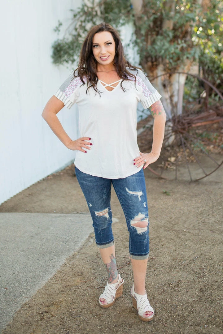 This short sleeve top is sure to be the best top you’ll own that will carry your right into Spring with. With a relaxed fit, this top features a v-neck with criss cross details, short sleeves with the most amazing stripe and floral contrasts and a rounded hem.