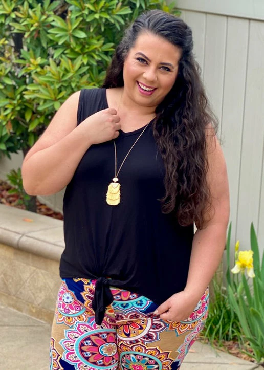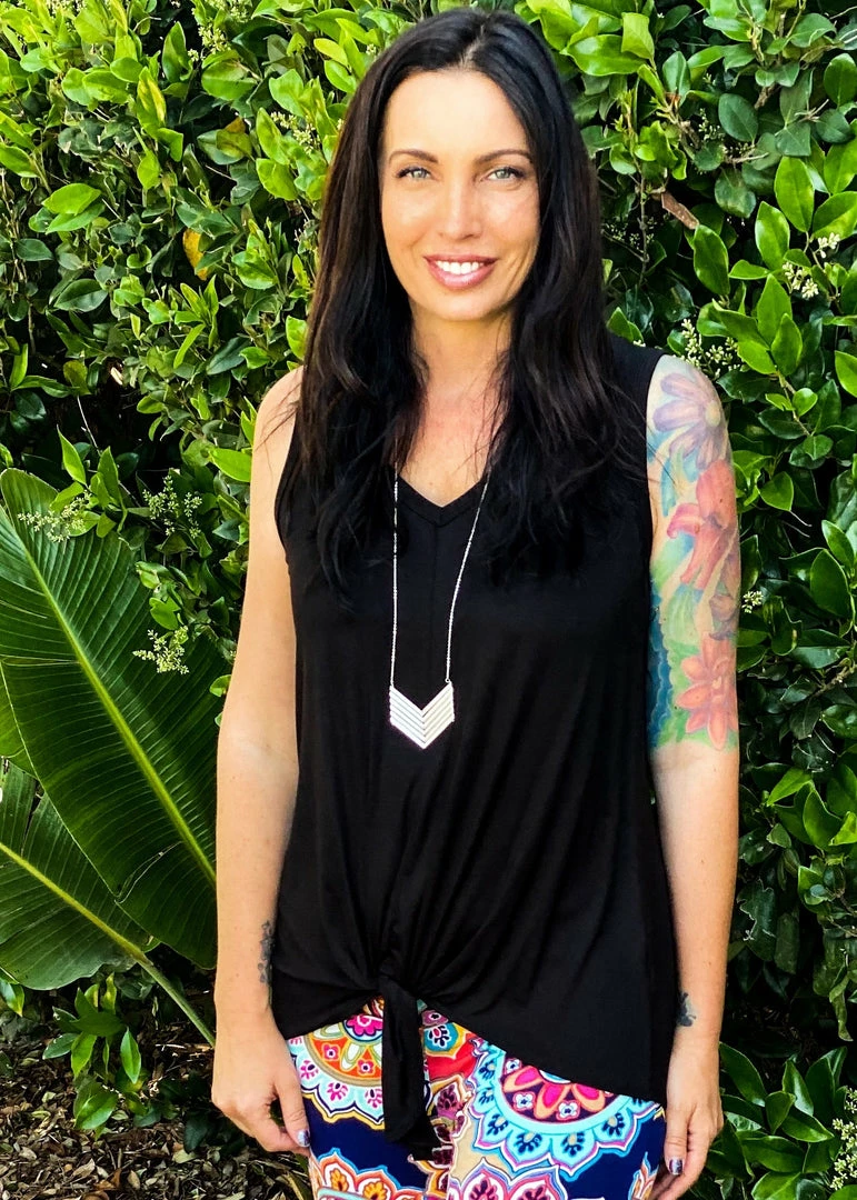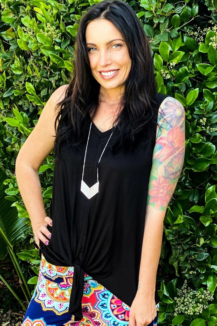 This top is the perfect everyday top! Pair it with your favorite shorts or skinnies for a complete look. This sleeveless top features a v-neck and front tie detail.