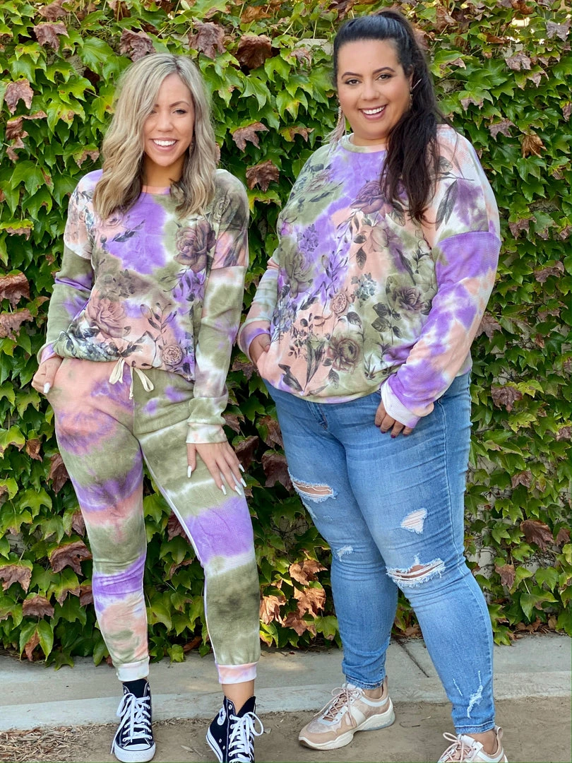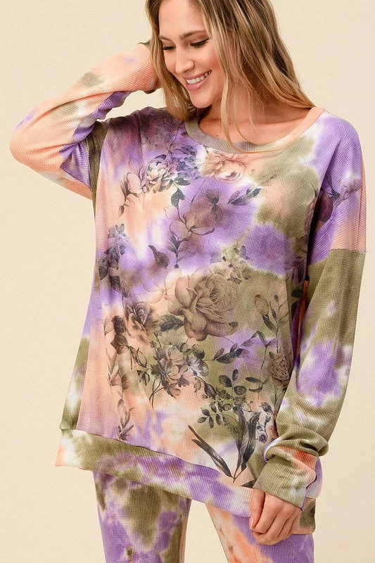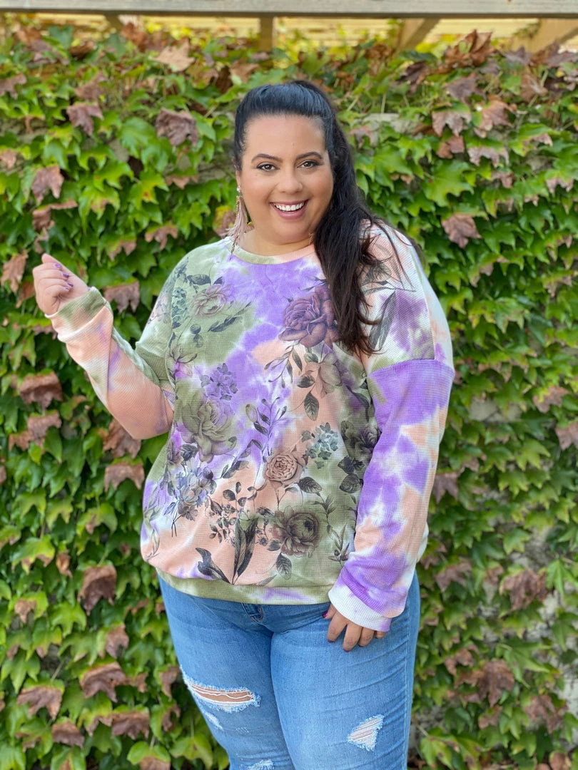 Find beauty in the storms with this gorgeous waffle knit pullover. We love the sublimated floral print on this top. With a relaxed fit, this top will pair well with just about everything!