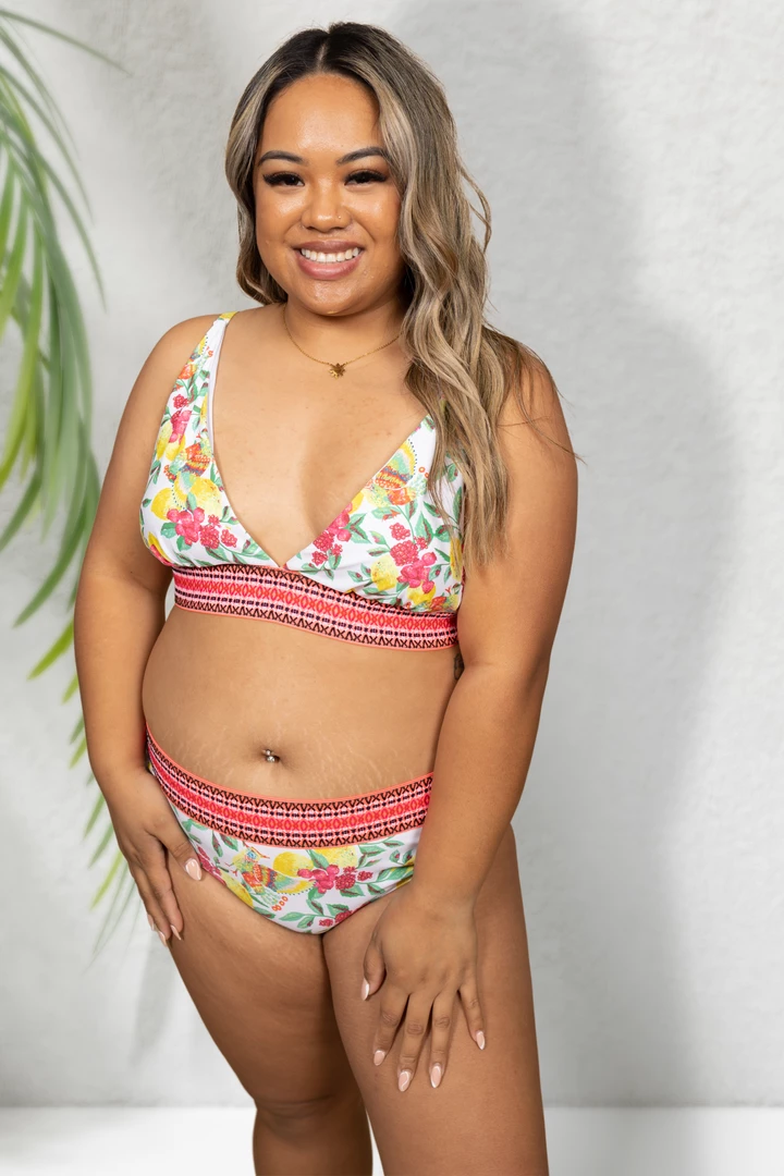 This two piece swimsuit will become your go to swimwear of the season. The high waisted printed bottoms are perfect for every body shape and the classic triangle cut top features adjustable straps to best fit your body.