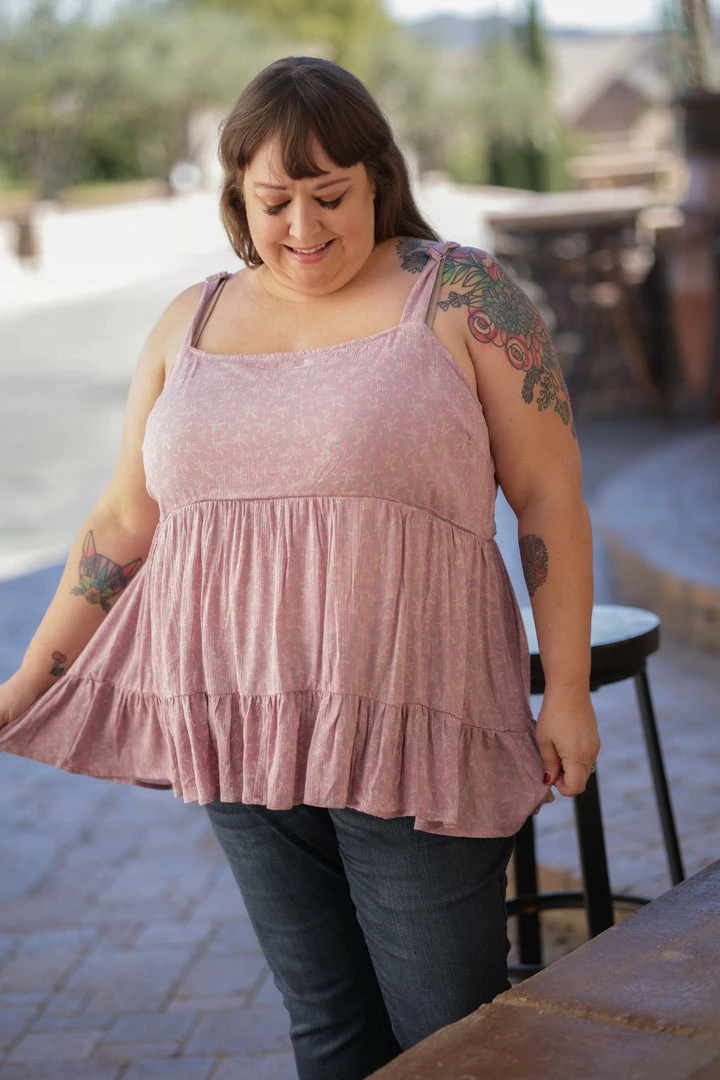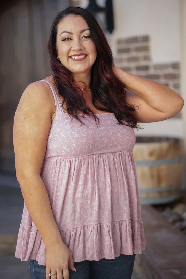 We are swooning over this mauve tiered ruffled tank. Made from a lightweight woven crinkle fabric, this top features a relaxed fit, square neckline, no fuss adjustable shoulder straps and tiered ruffled hem.