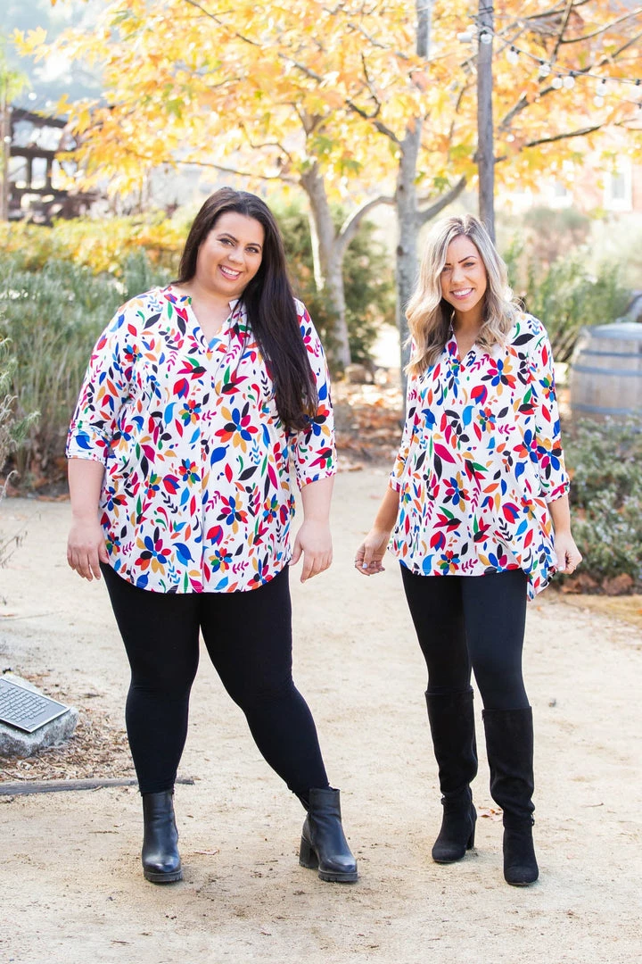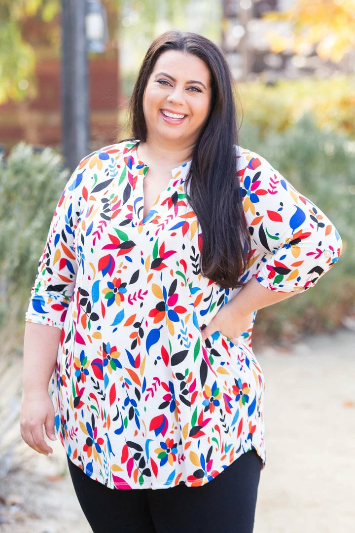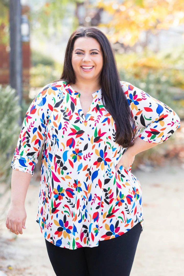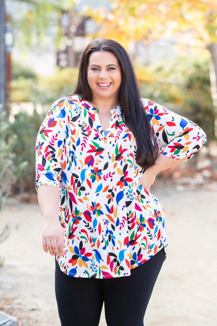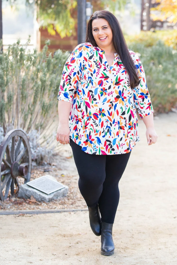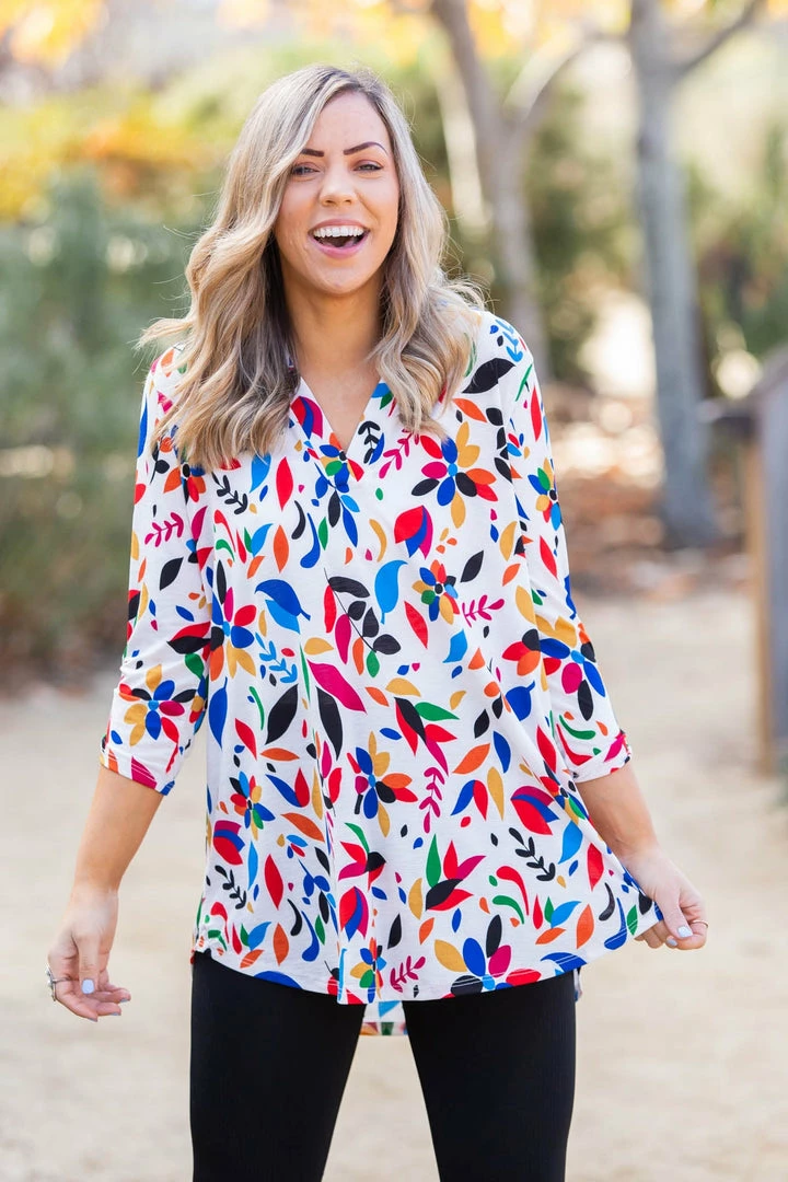 Searching for the perfect lightweight tunic? Look no further. The print on this Gabby has us feeling like we are vacationing in Boca Raton! Featuring a banded collar, v-neck and buttoned 3/4 sleeves, this top will make getting dressed seem effortless.