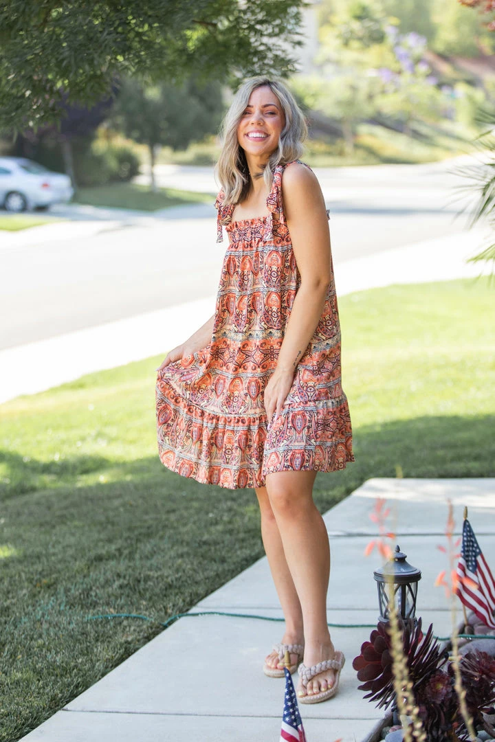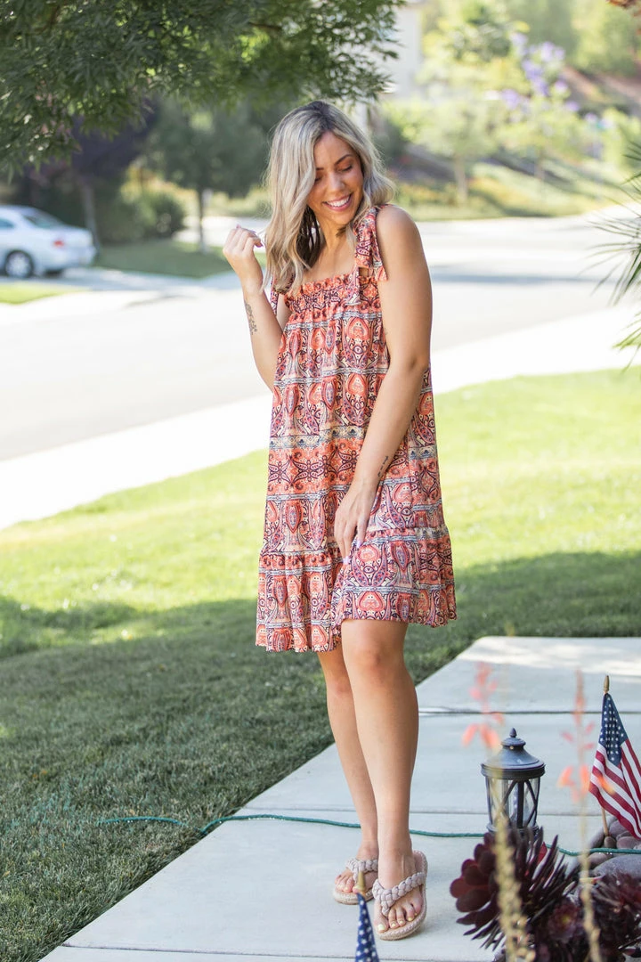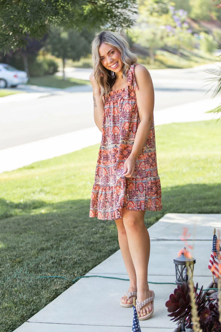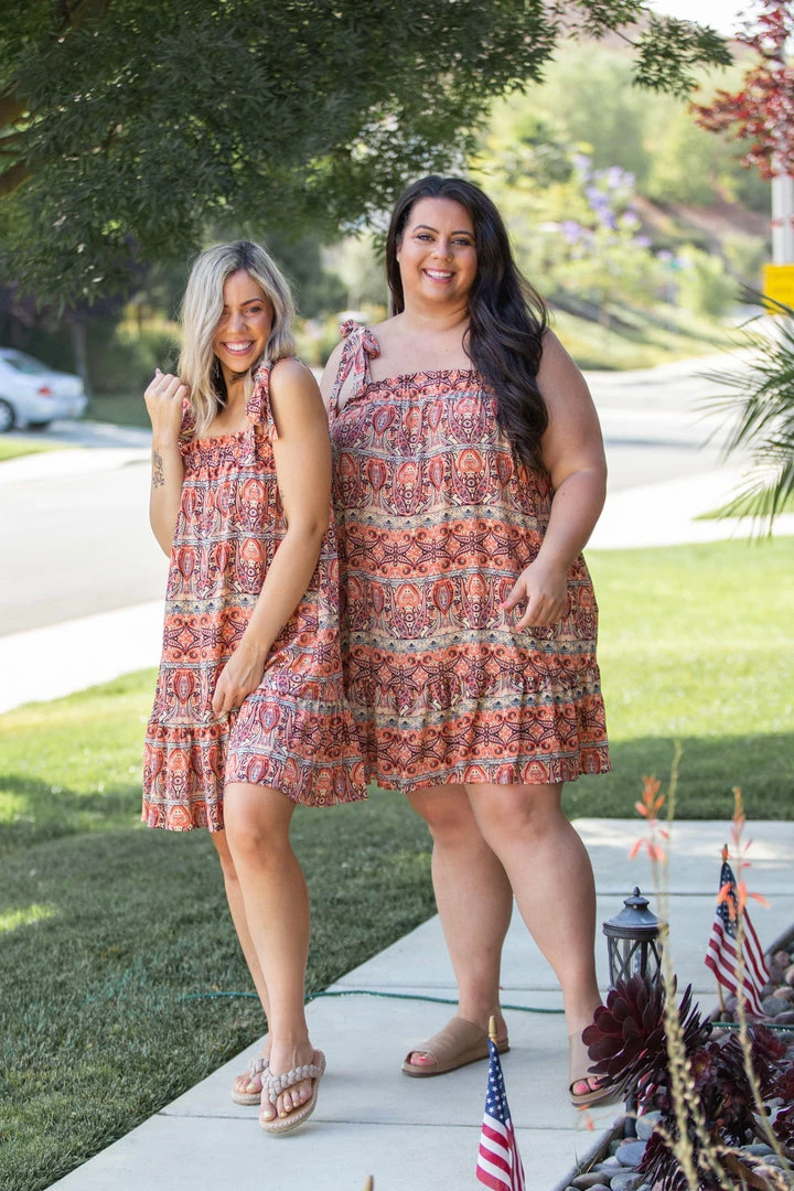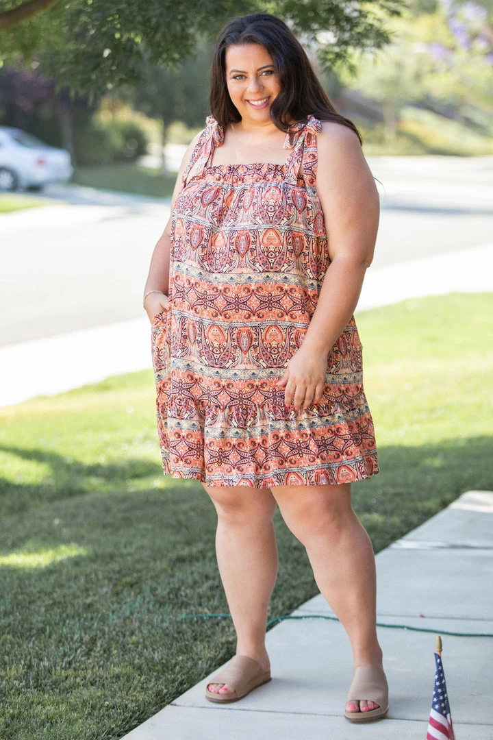 Made from a rayon crinkle fabric, this dress will be sure to keep you cool even on the hottest of days. With a relaxed fit, this dress features an elastic banded sash strap, shoulder ties and side pockets.