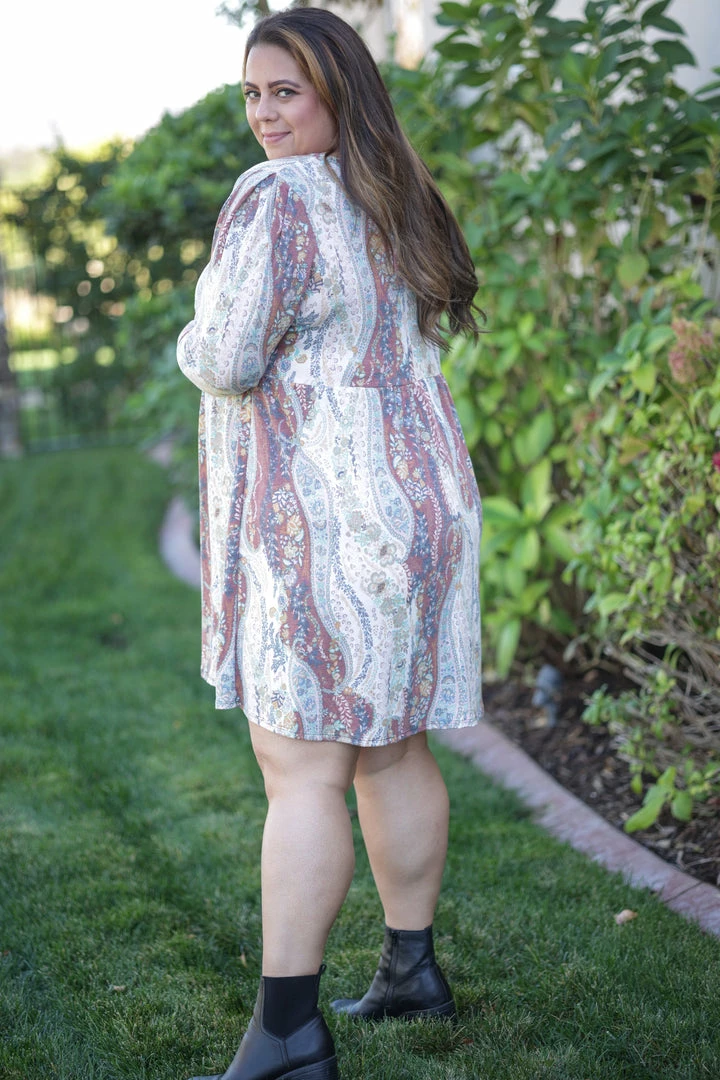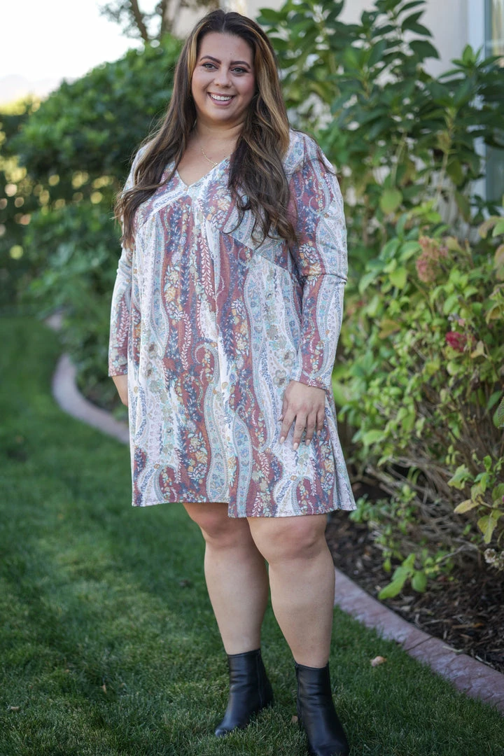 We are swooning over this boho inspired swing dress. With an a-line silhouette this dress features a deep v-neck, long sleeves and rounded hem.