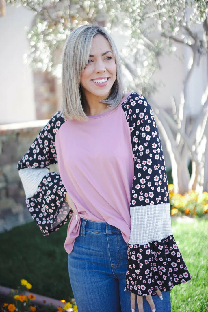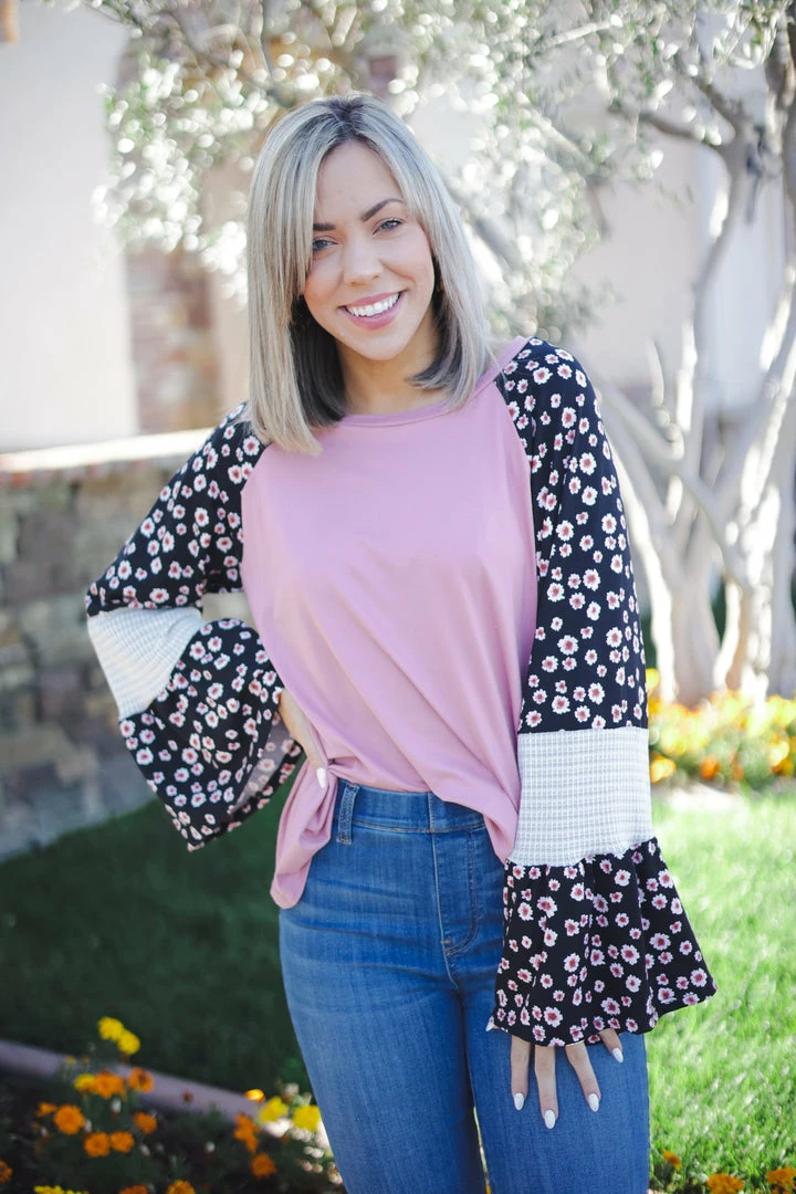 You will cherish this buttery soft bell sleeve with all you have. We are especially in love with those jacquard color block sleeves! With a relaxed fit, this top features a round neckline, long bell sleeves and rounded hem.
