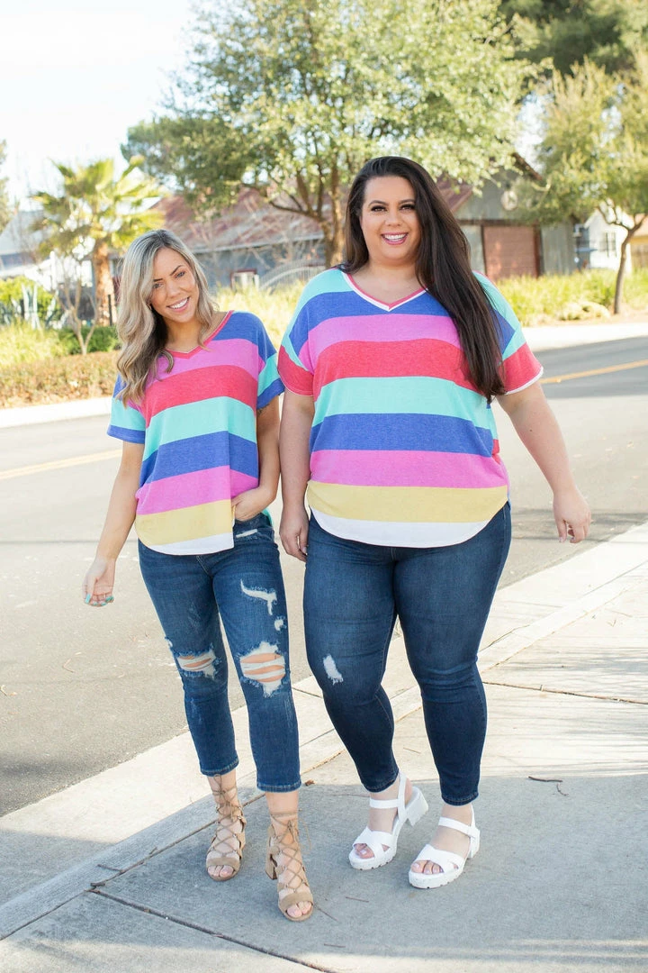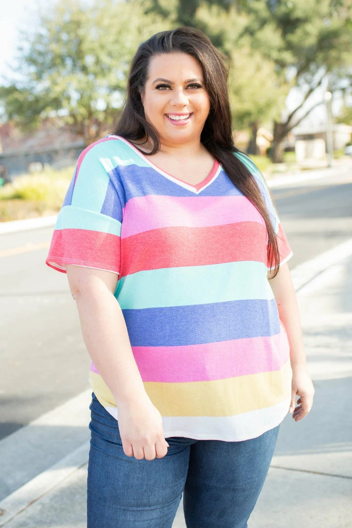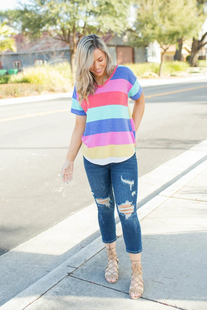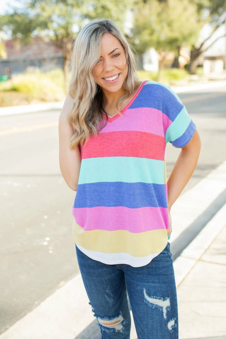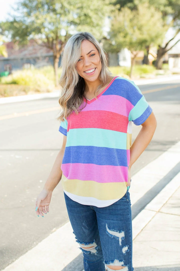 The colorways in this striped short sleeve top are the classic seaside colors. Featuring a relaxed fit, short dolman sleeves and a v-neck, this top will pair well with just about anything. .