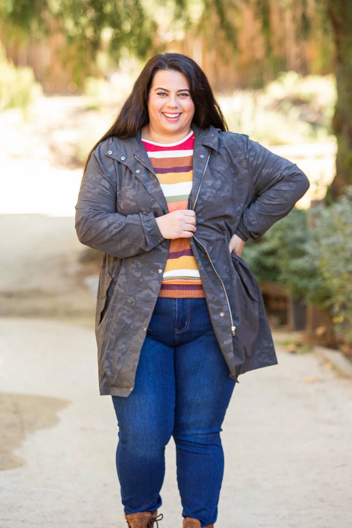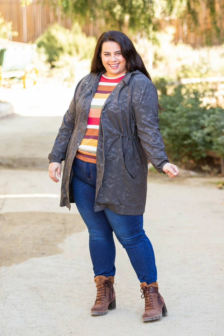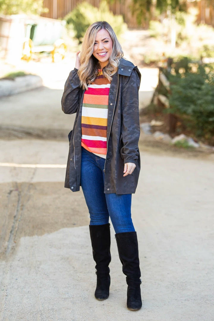 Talk about the most functional piece you could ever own. This windbreaker jacket comes with it’s own carry along pouch that you can attach to your purse for easy carrying when you don’t need to wear it anymore throughout the day. This windbreaker has a cinchable waist zipper and button front closure, long sleeves, hood and pockets!