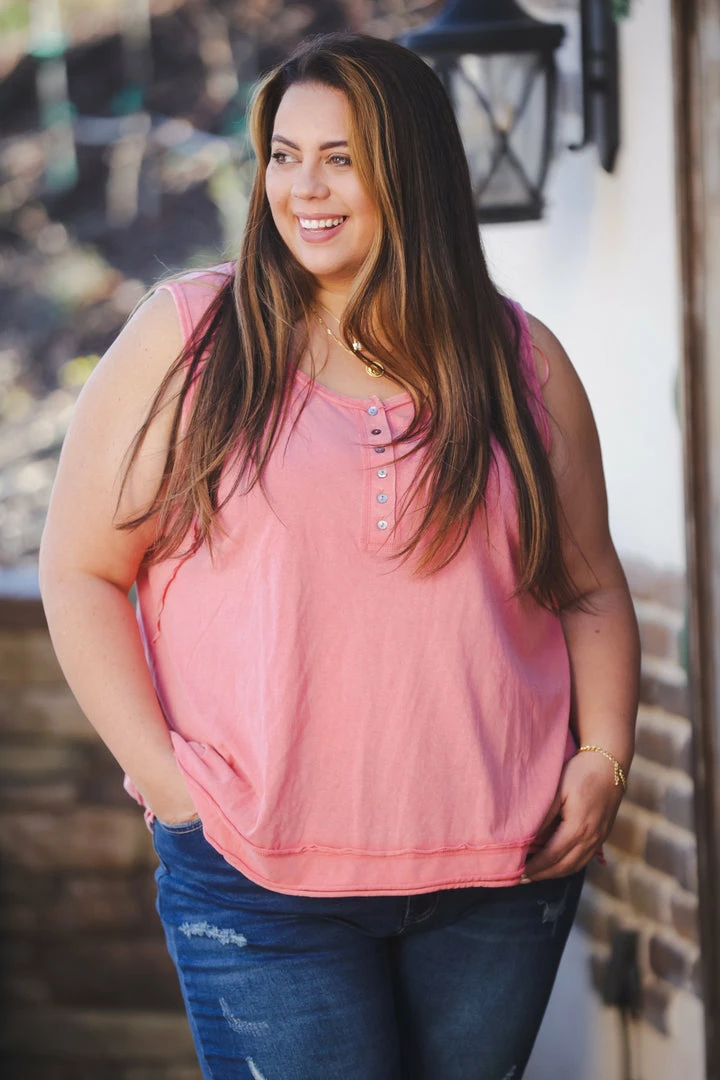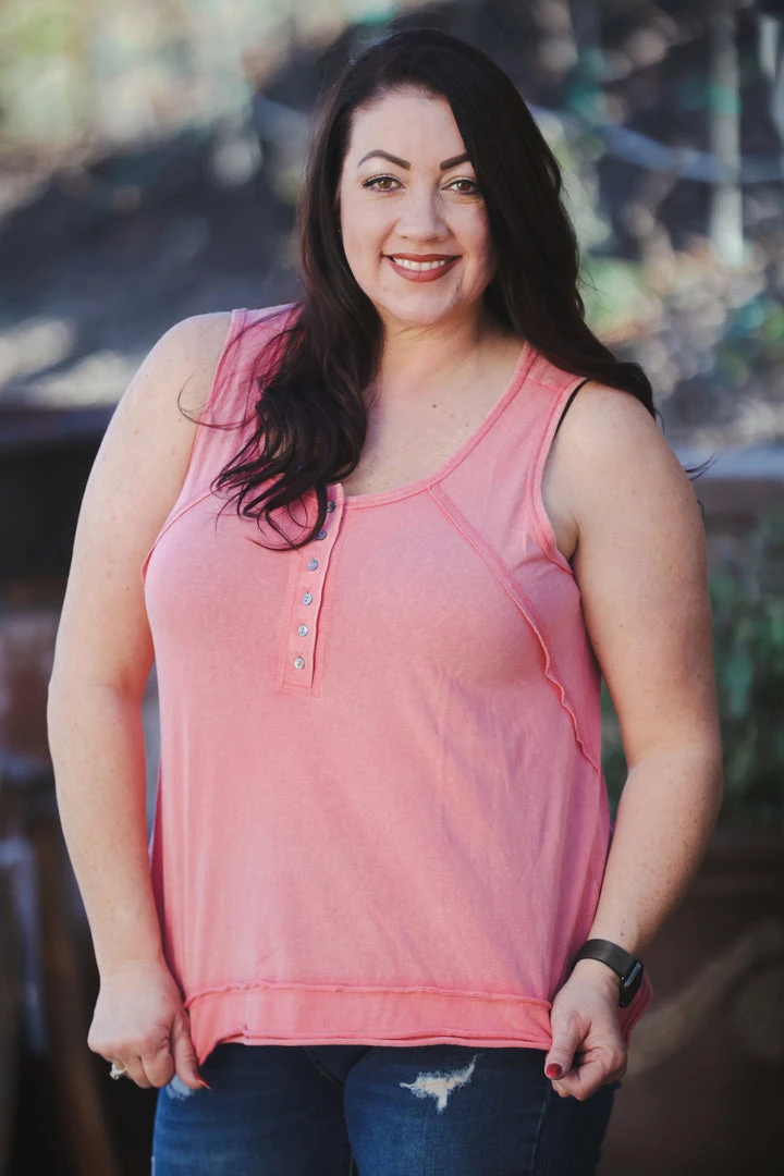 We are so excited for bright colors, and this sleeveless top has us ready for warm weather. With a relaxed fit, this top features a scoop neck with functioning front buttons, raw cut edges and exposed seams.