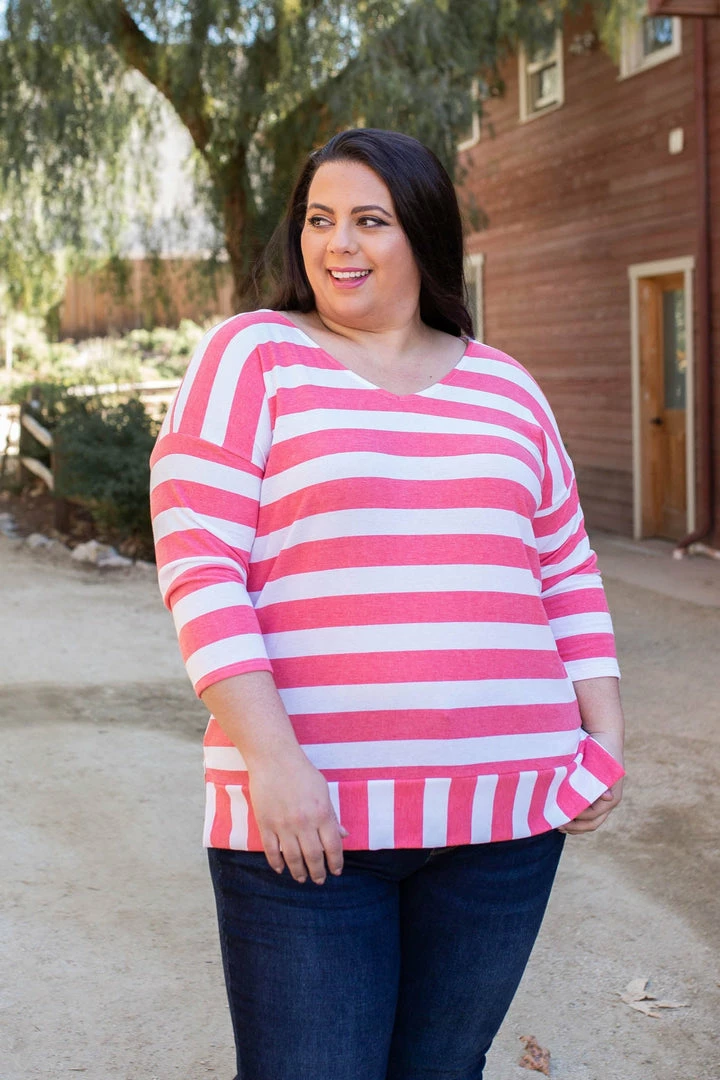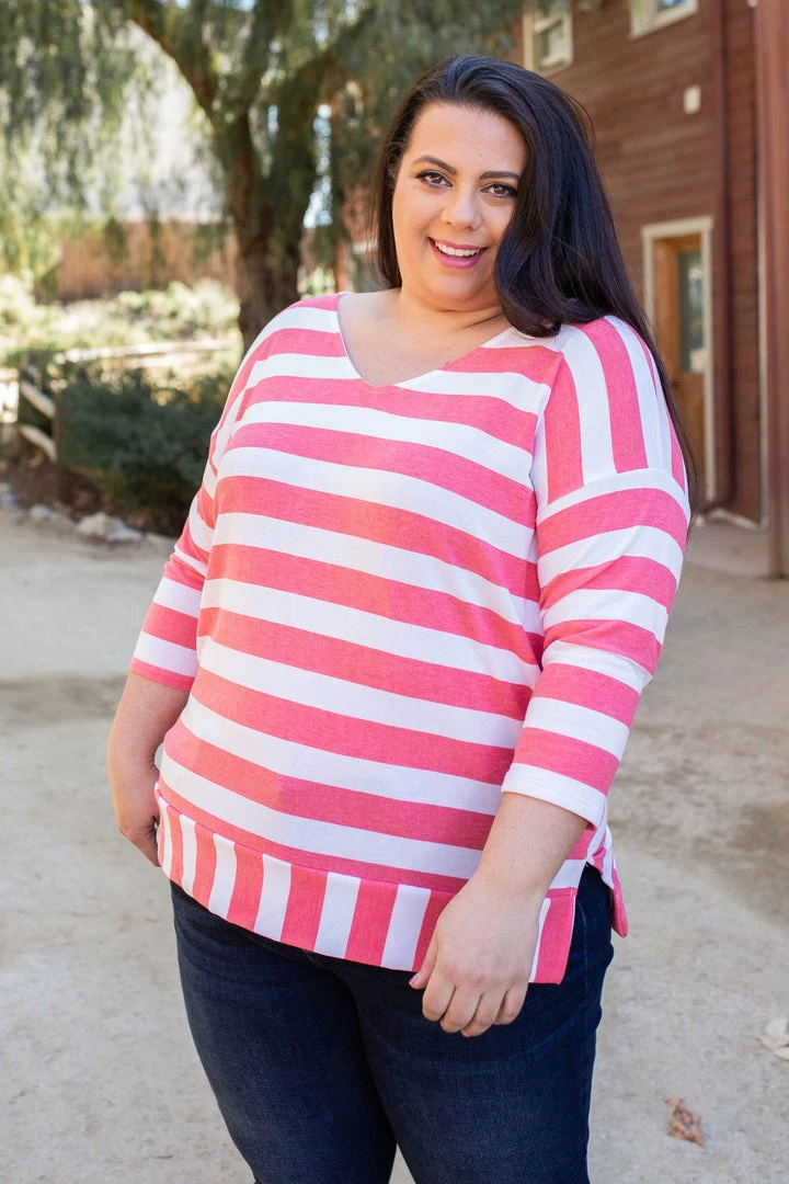 We’re ready for warmer days with this coral and white striped 3/4 sleeve top. Featuring a relaxed fit, v-neck and vertical stripes on the hem which makes for a flattering and slimming look.